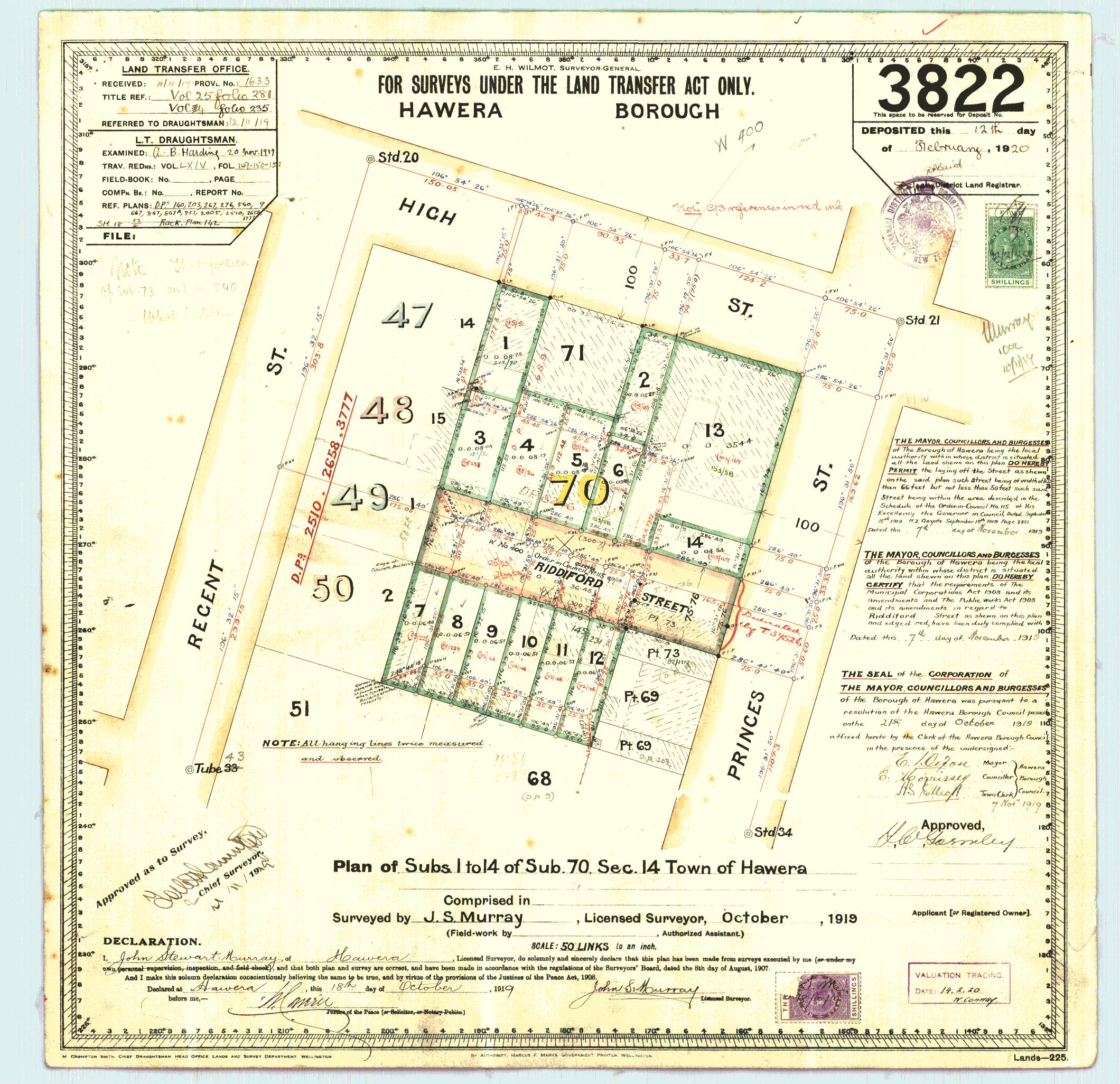 Taranaki (Lots 1 & 3) DP3822 Sheet 1 (1919), ICS Pre 300,000 Cadastral Plan Index (Imaged by LINZ)