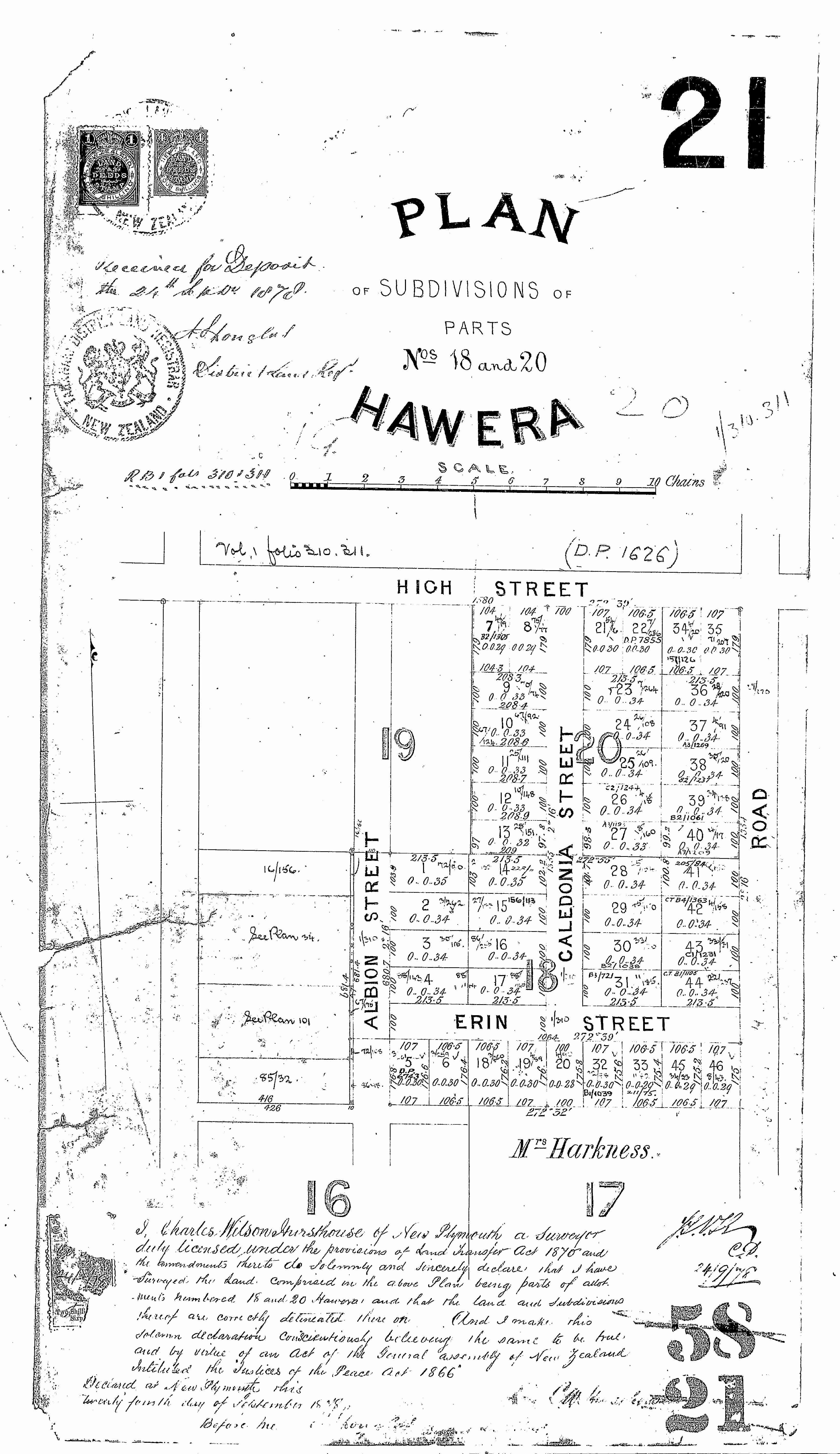 Taranaki (Lot 21) DP21 Sheet 1 (1878), ICS Pre 300,000 Cadastral Plan Index (Imaged by LINZ)