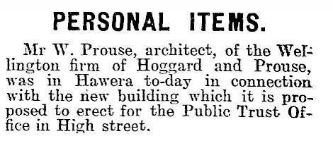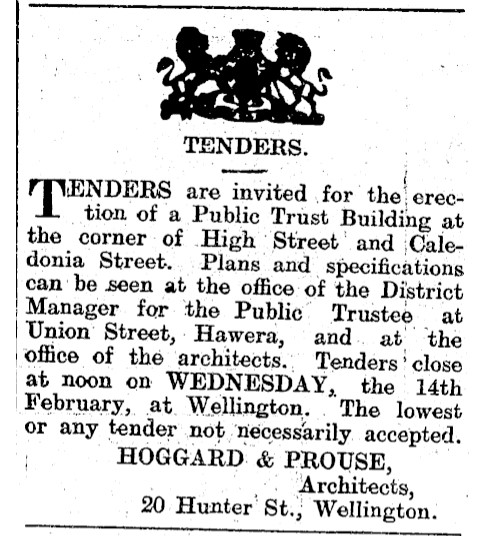 Wellington architects, Messrs. Hoggard and Prouse designed the building and called for tenders in February 1912. The successful tender came from Messrs. Campbell and Burke of Wellington.