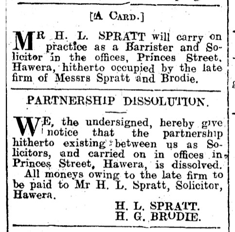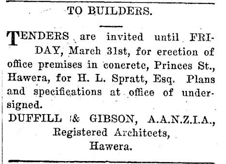 The previous year Spratt dissolved his business partnership with fellow solicitor, H. G. Brodie, and went out on his own. In April 1922 Hāwera architects Duffill & Gibson called for tenders to erect office premises for H.L. Spratt in Princes Street.