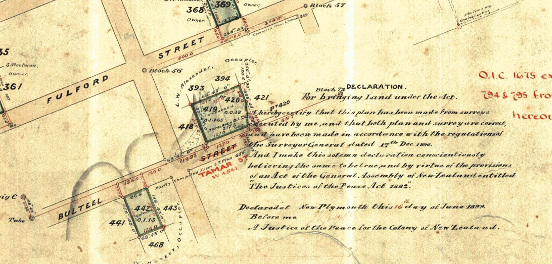 Taranaki DP1323 (cropped) Sheet 1 (1899), ICS Pre 300,000 Cadastral Plan Index (Imaged by LINZ)