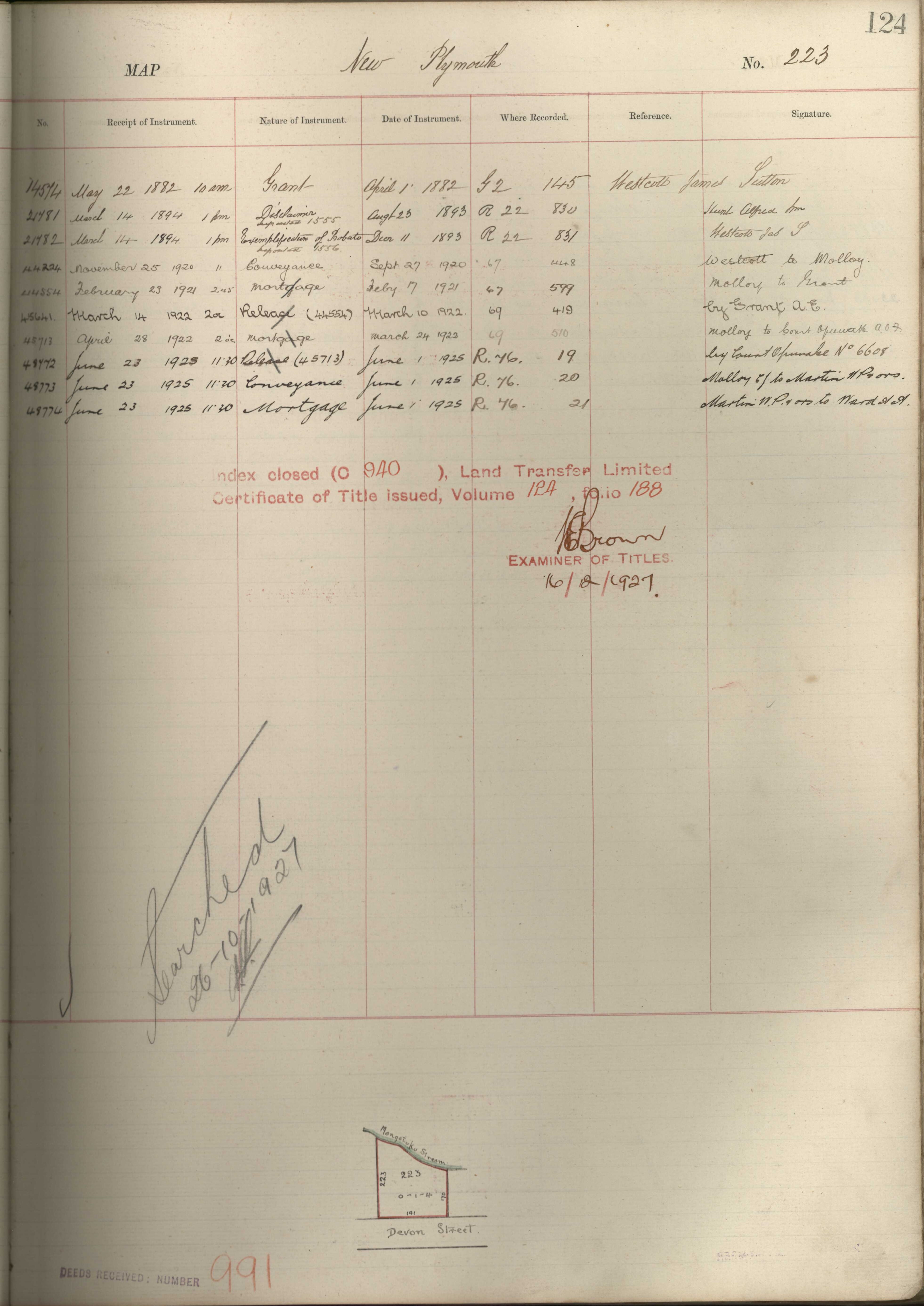 Town Section 223, Taranaki Land Deed Index I13 page 124. (Archives New Zealand)
