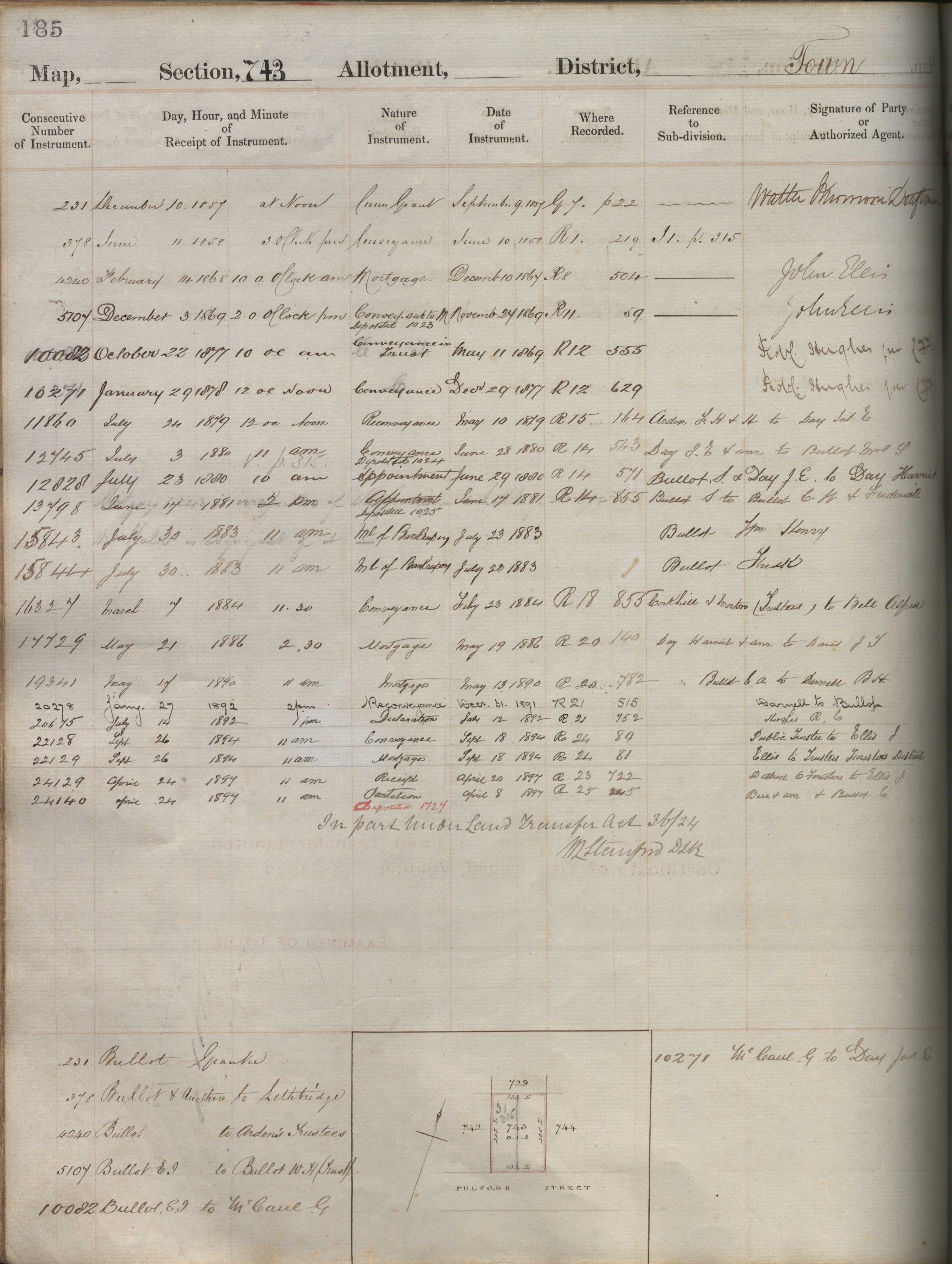 Town Section 743, Taranaki Land Deed Index I1 page 185. (Archives New Zealand)