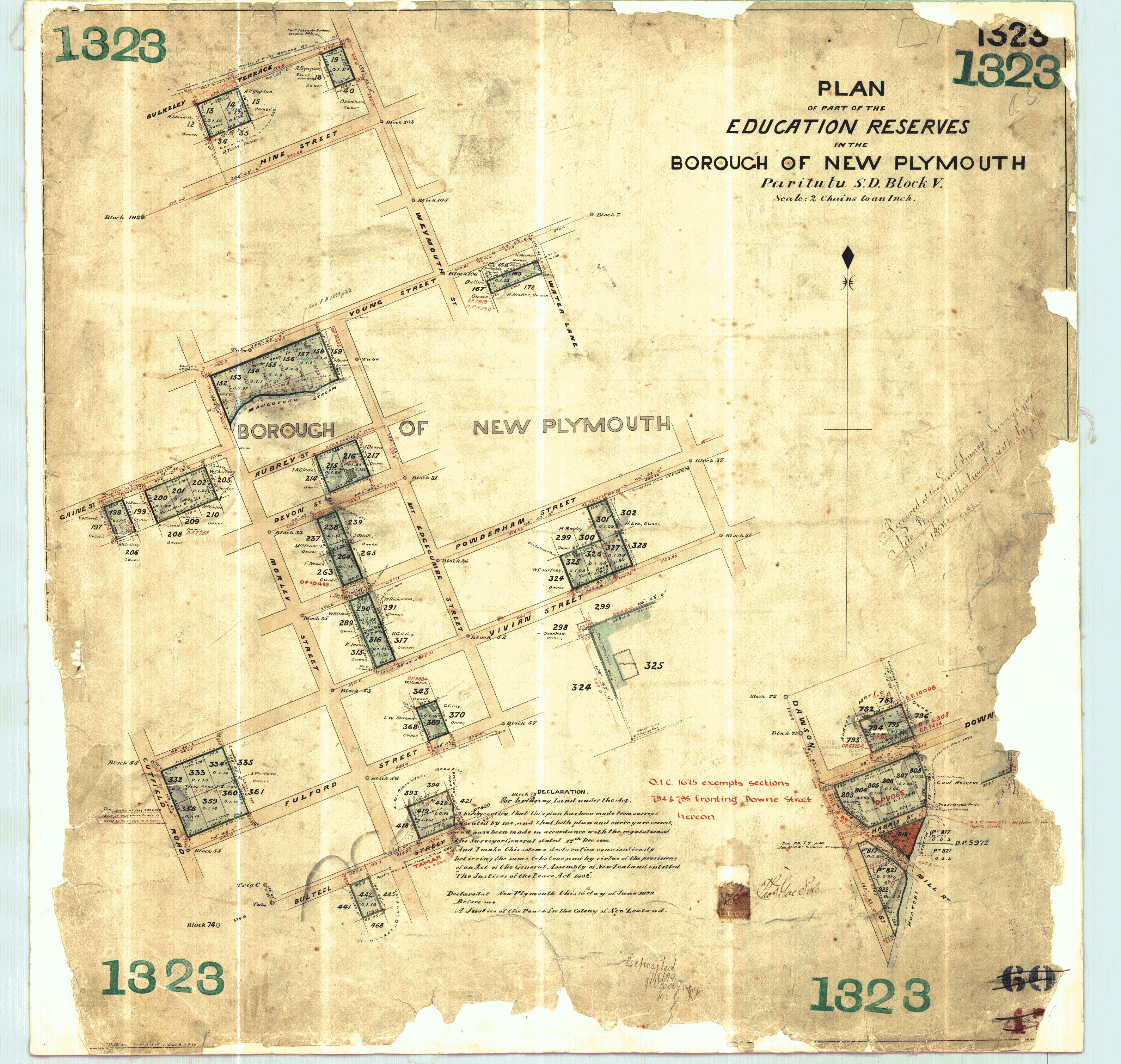 Taranaki DP1323 Sheet 1 (1899), ICS Pre 300,000 Cadastral Plan Index (Imaged by LINZ)