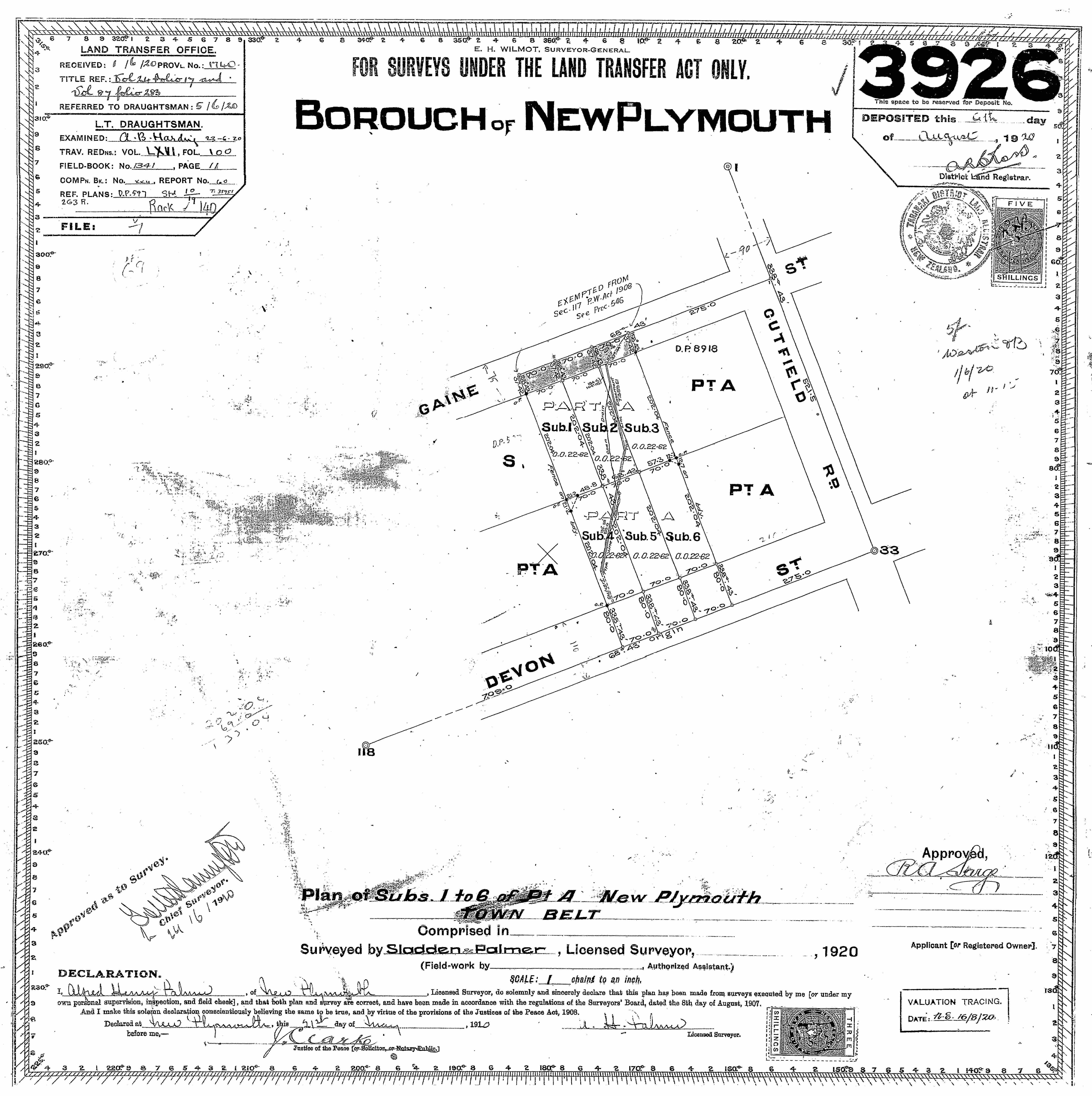 Taranaki (Lot 2) DP3926 Sheet 1 (1920), ICS Pre 300,000 Cadastral Plan Index (Imaged by LINZ)