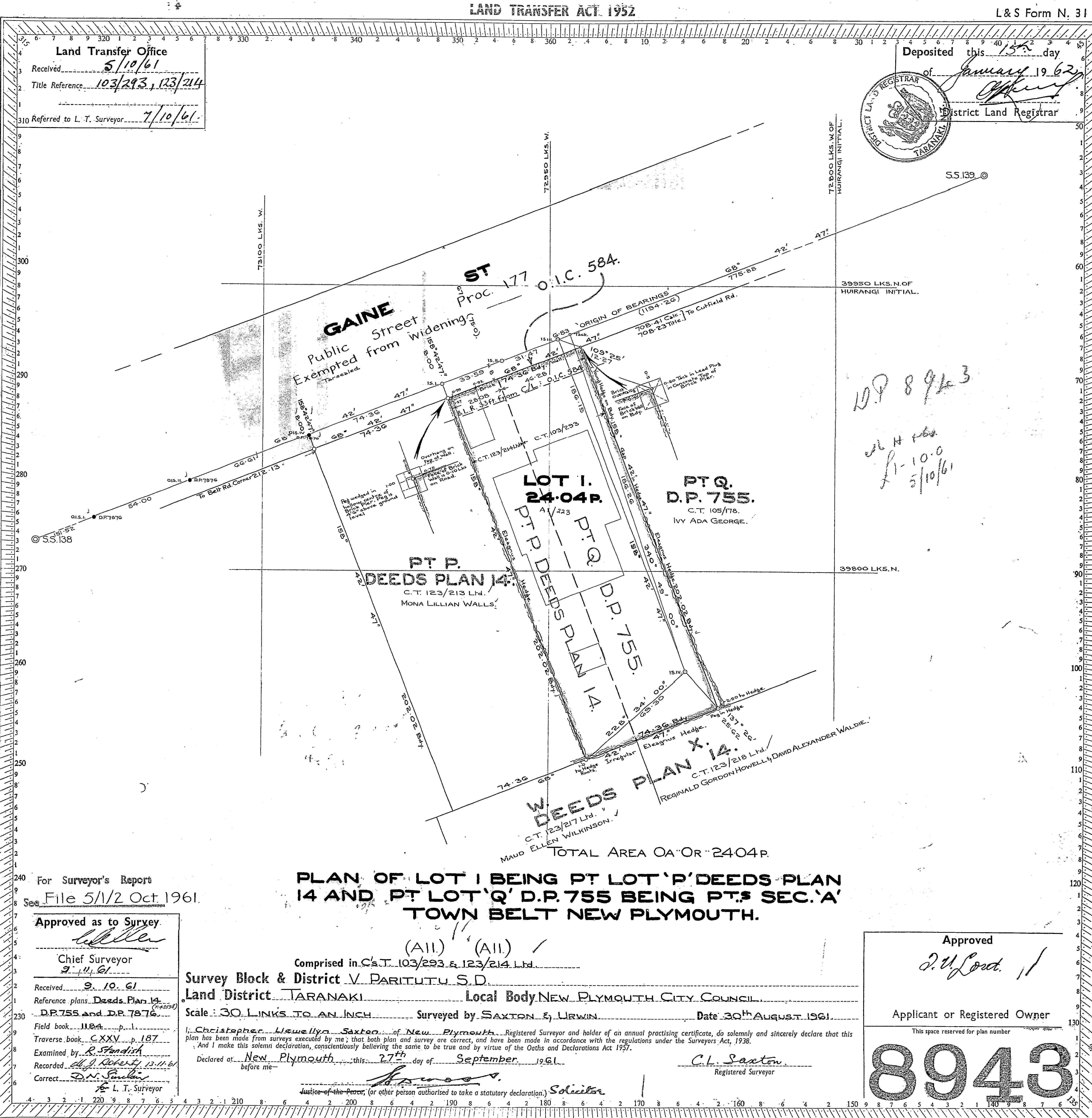 Taranaki (Lot 1) DP8943 Sheet 1 (1961), ICS Pre 300,000 Cadastral Plan Index (Imaged by LINZ)