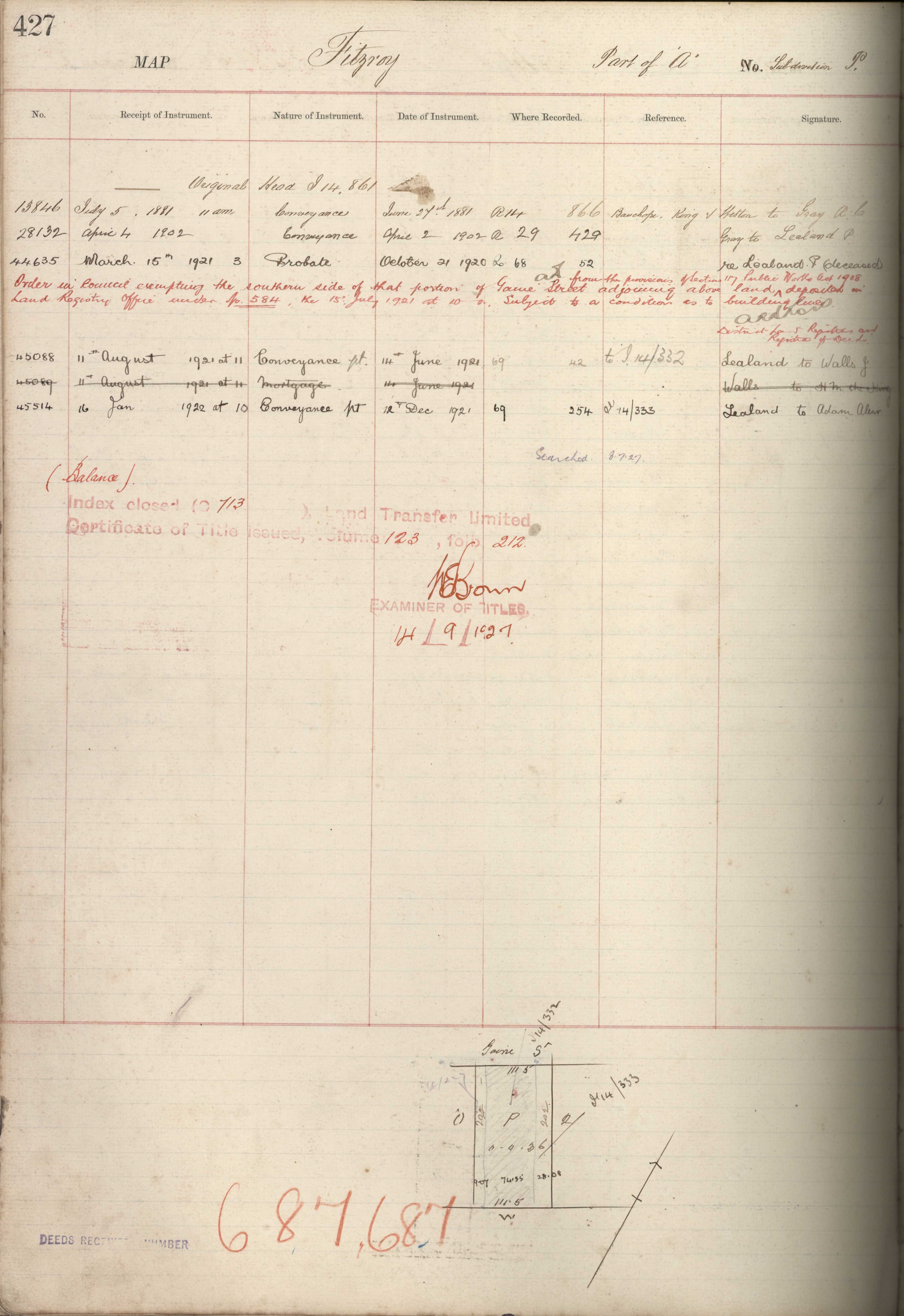 Town Belt (Part) A Section P, Taranaki Land Deed Index I14 page 427. (Archives New Zealand)