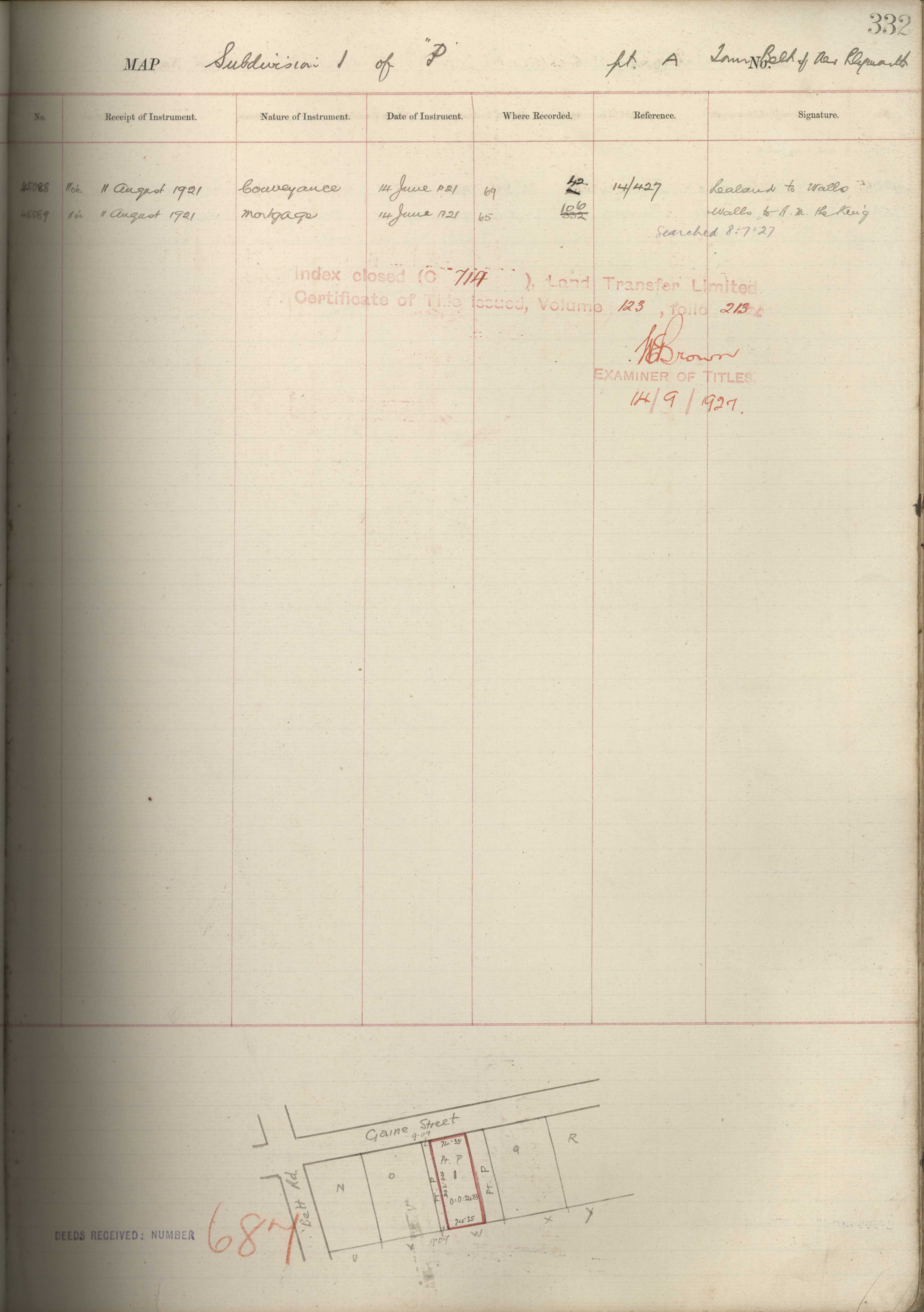 Town Belt (Sub 1 Part) A Section P, Taranaki Land Deed Index I14 page 332. (Archives New Zealand)