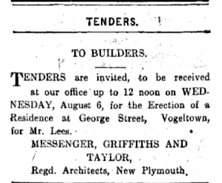 The architects were likely the noted New Plymouth firm of Messenger, Griffiths & Taylor, who advertised for tenders for the erection of a residence in George Street for Mr Lees during July 1924.