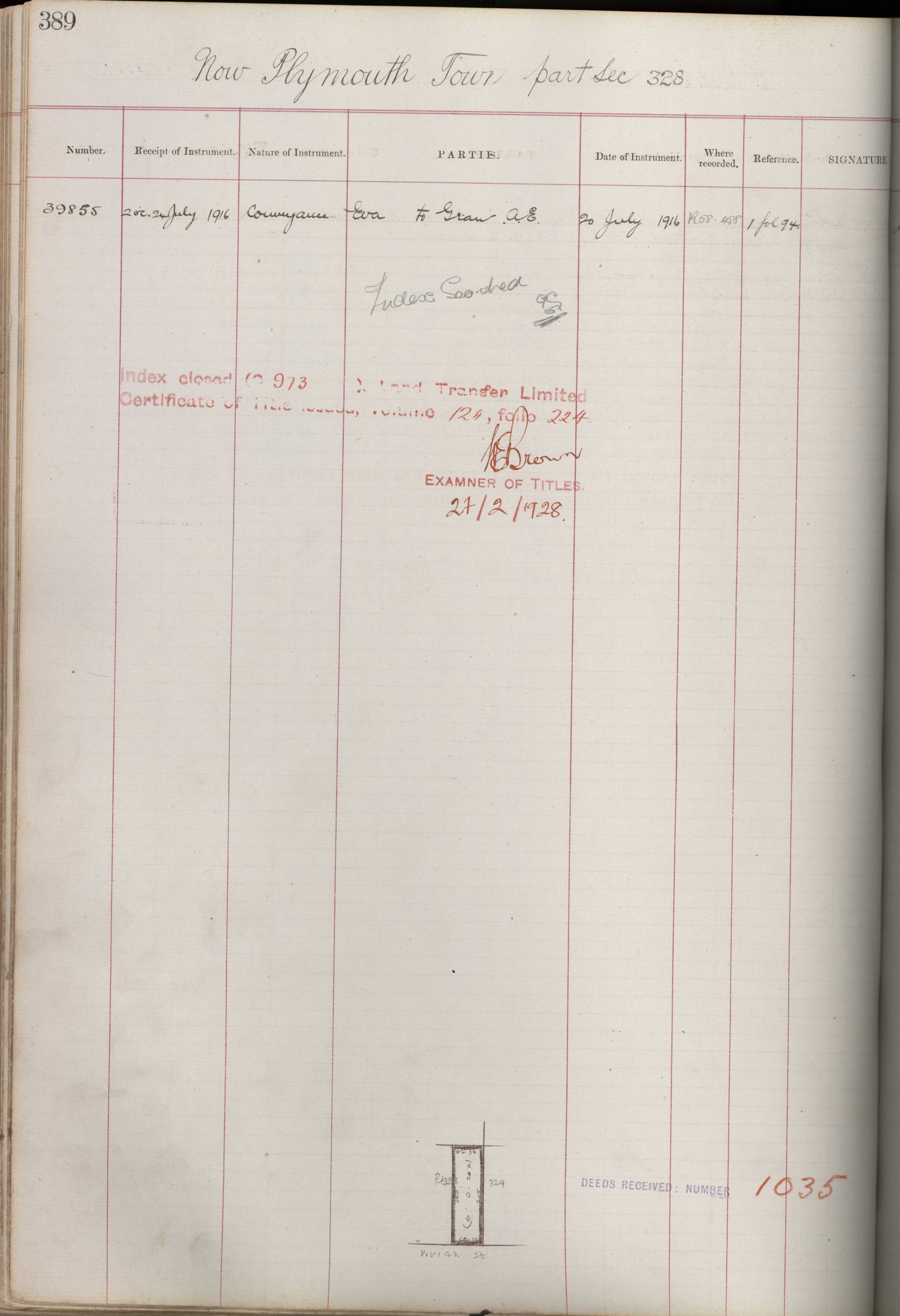 Town Section (Part) 328, Taranaki Land Deed Index I6 Page 389. (Archives New Zealand)