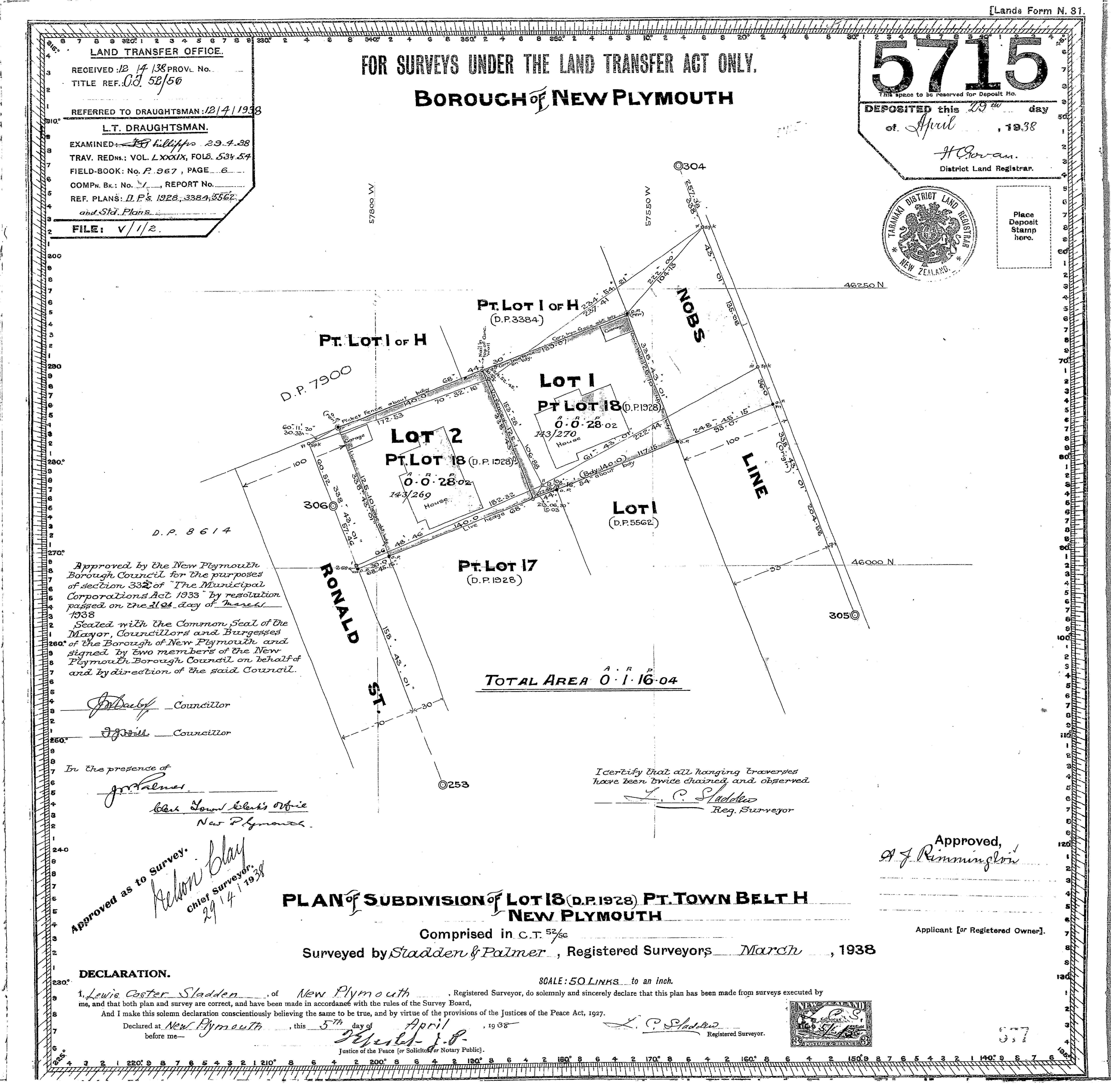 Taranaki (Lot 2) DP5715 Sheet 1 (1938), ICS Pre 300,000 Cadastral Plan Index (Imaged by LINZ)