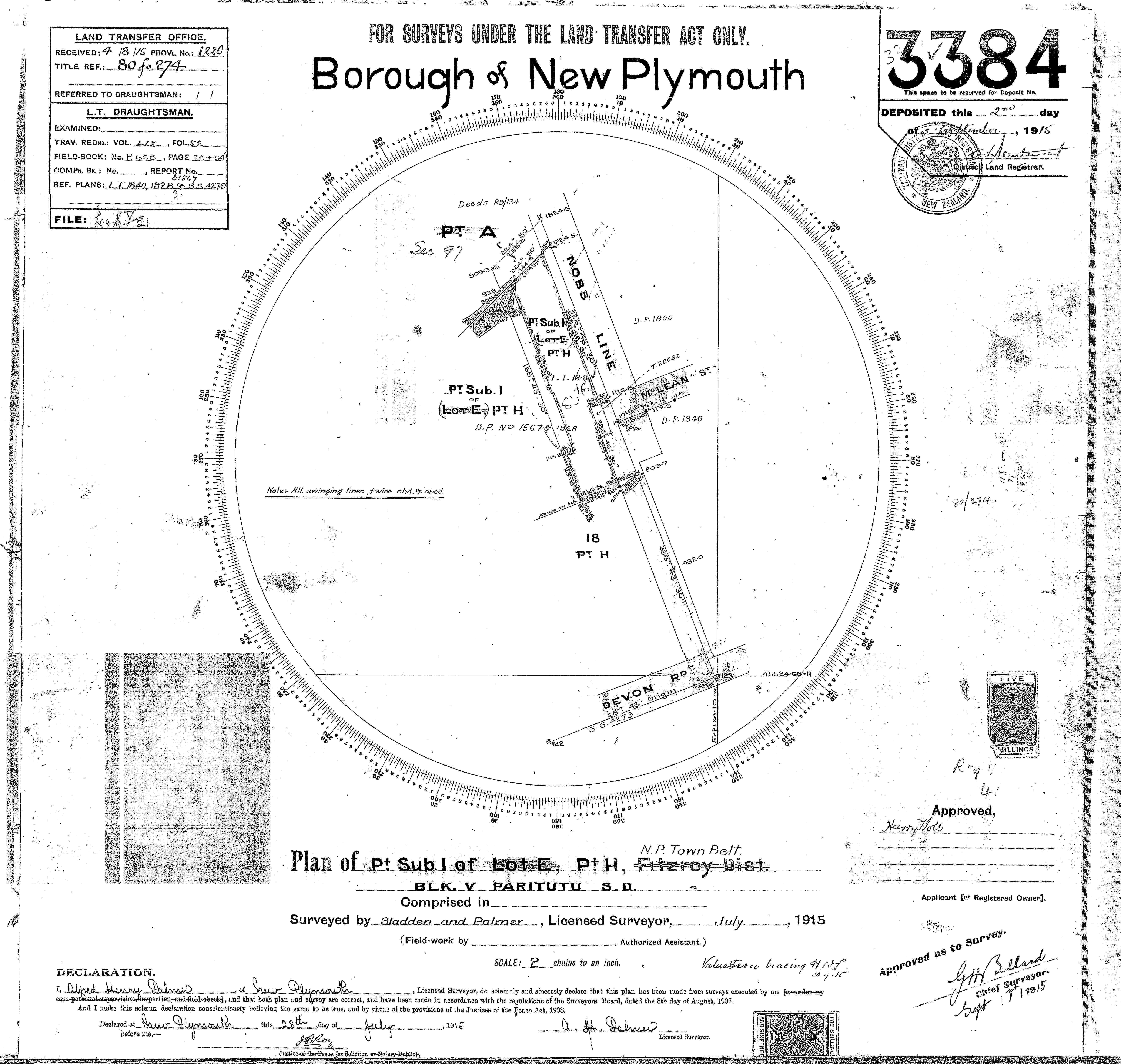 Taranaki DP3384 Sheet 1 (1915), ICS Pre 300,000 Cadastral Plan Index (Imaged by LINZ)