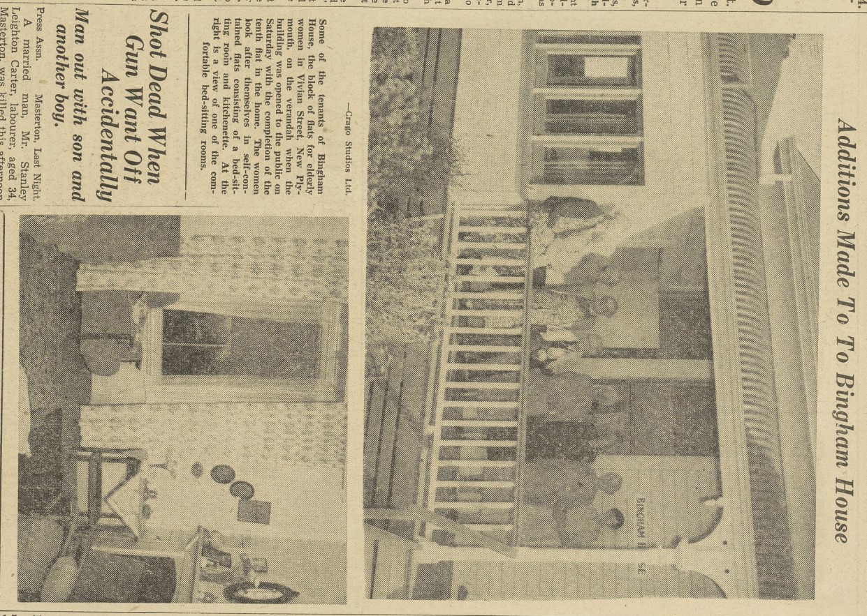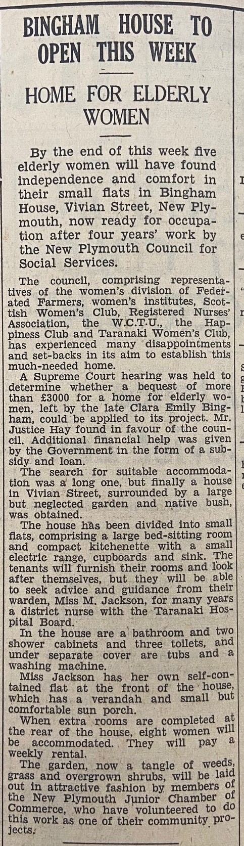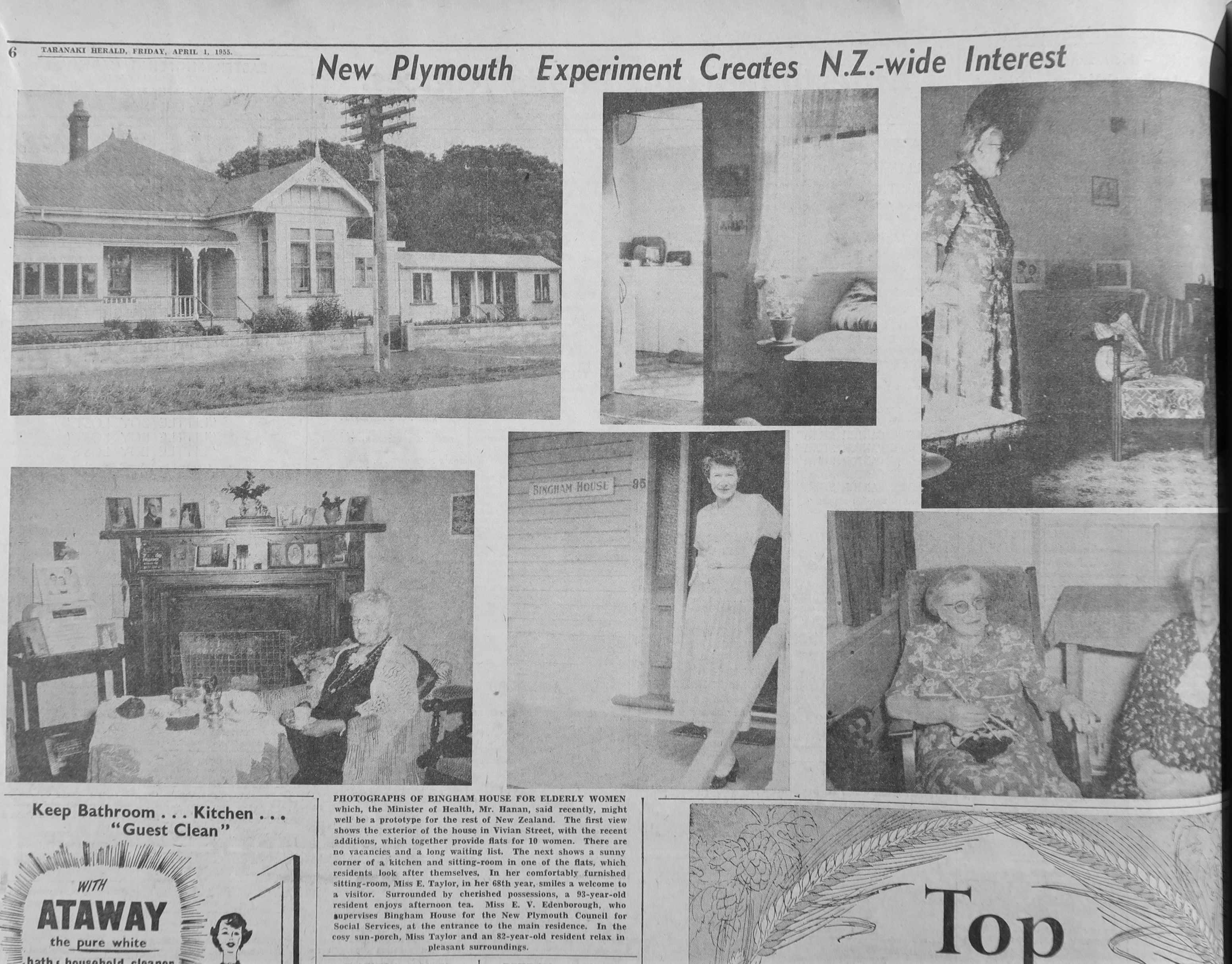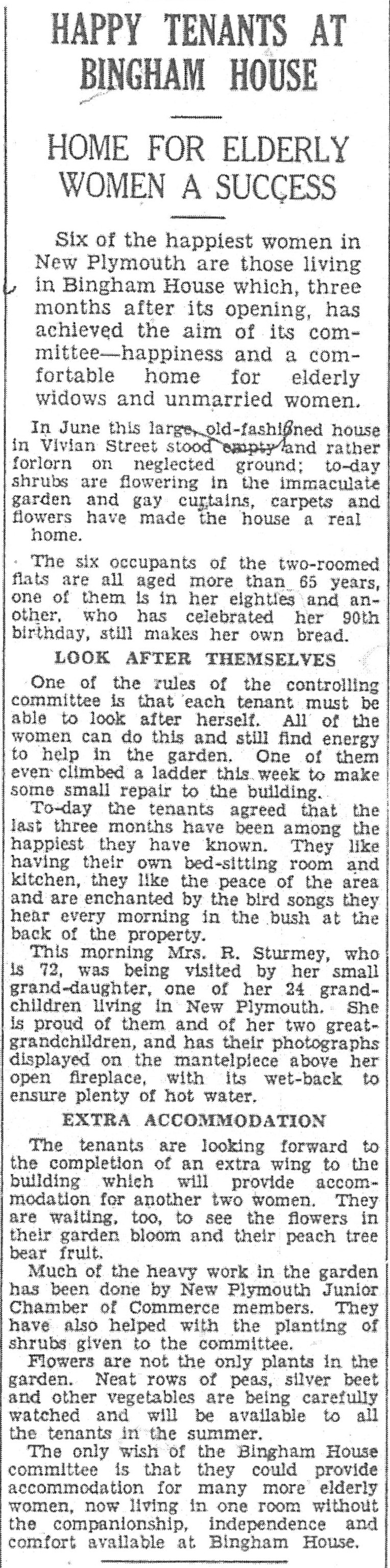 In June 1952 six elderly women settled into Bingham House on Vivian Street, each with their own room and cooking facilities. The house was owned by the New Plymouth Council for Social Services, an incorporated society set up in the late 1940s with an aim to provide safe, comfortable accommodation for widows or unmarried women over the age of 65 who were able to care for themselves. In 1955, the Minister of Health suggested this might be a "prototype for the rest of New Zealand".
