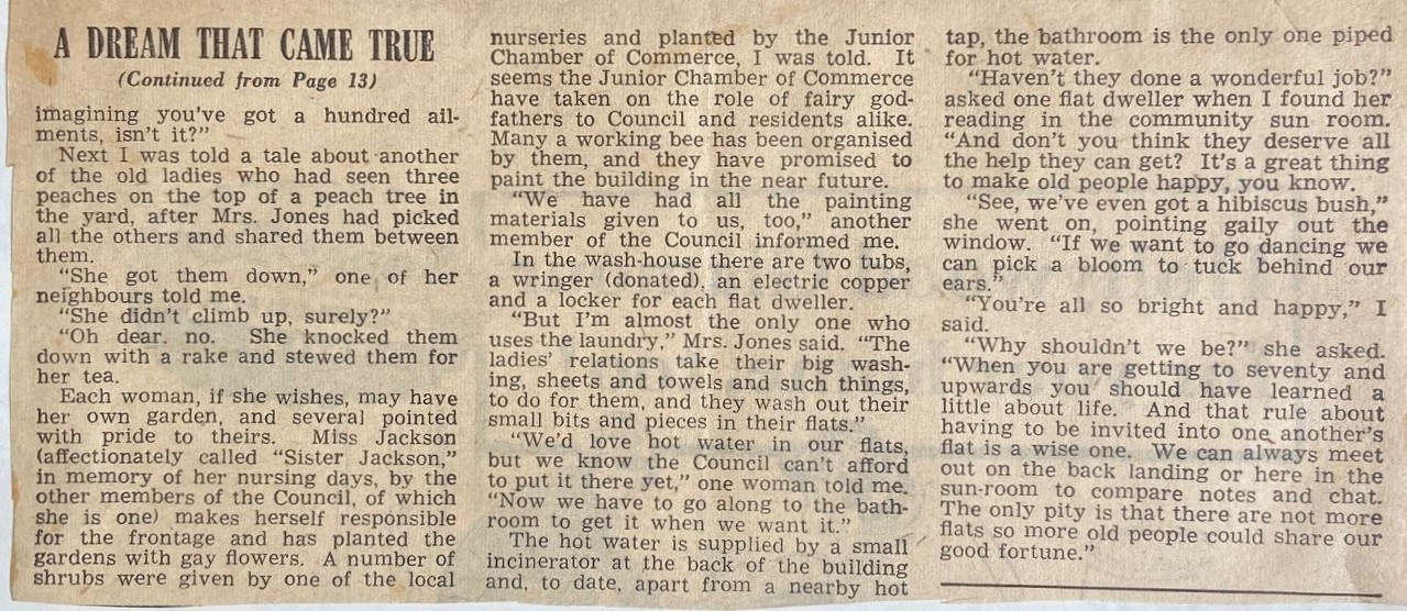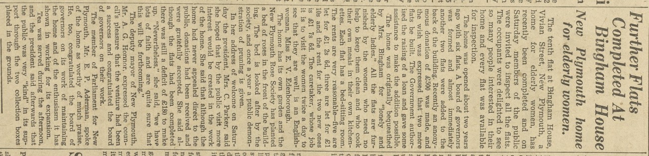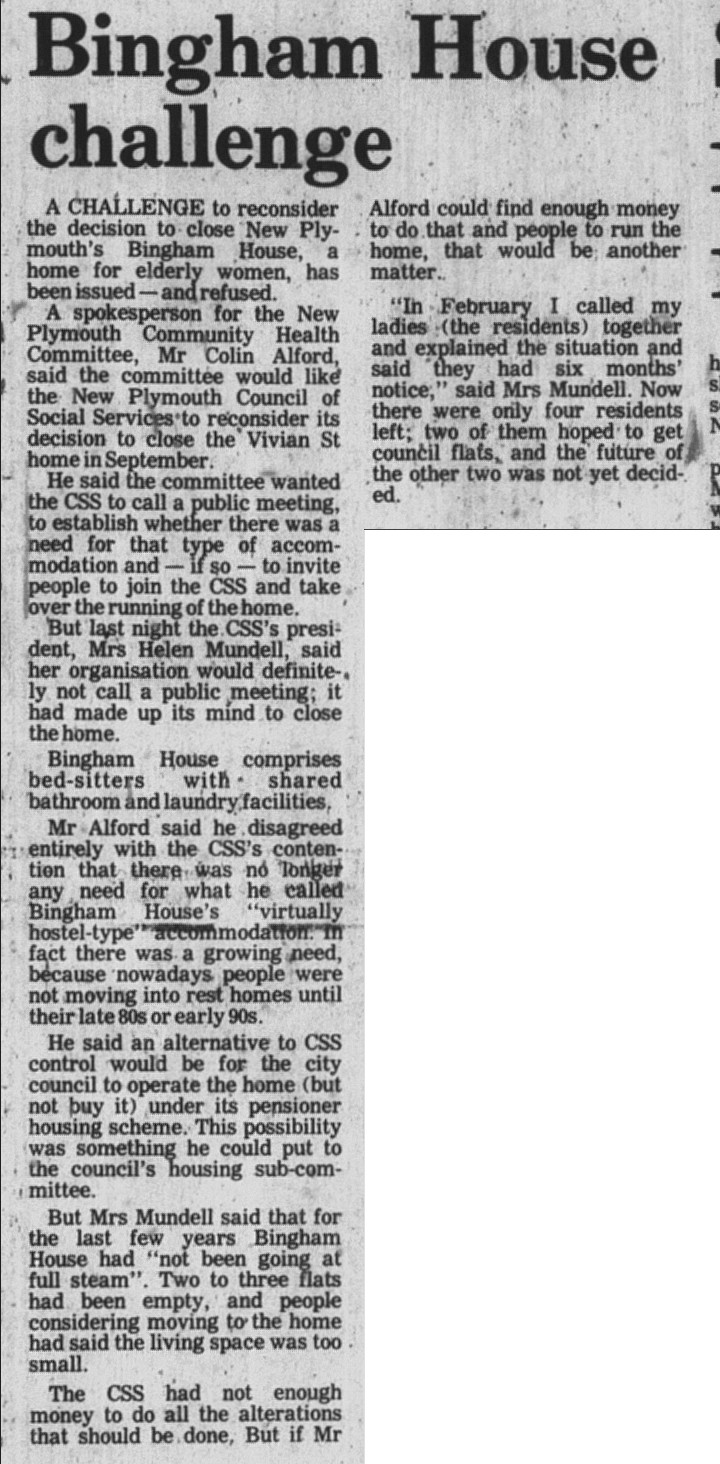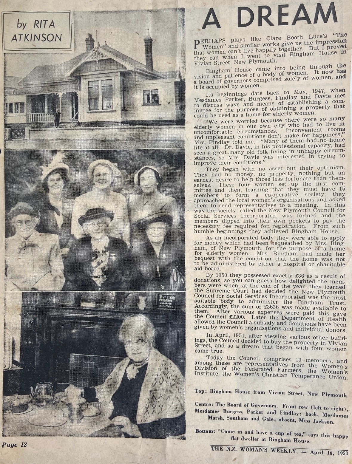 In June 1952 six elderly women settled into Bingham House on Vivian Street, each with their own room and cooking facilities. The house was owned by the New Plymouth Council for Social Services, an incorporated society set up in the late 1940s with an aim to provide safe, comfortable accommodation for widows or unmarried women over the age of 65 who were able to care for themselves. In 1955, the Minister of Health suggested this might be a "prototype for the rest of New Zealand".