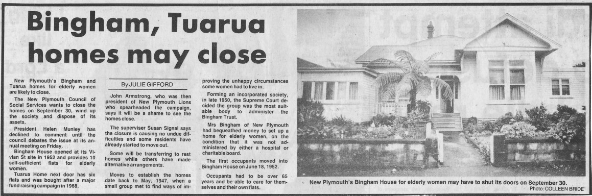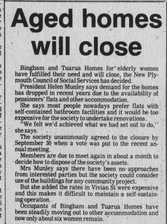 In February 1989 the Taranaki Herald reported that the society running the two houses had decided unanimously to close them due to a drop in demand for homes like this. The availability of pensioners' flats and other accommodation, as well as the cost of running the Vivian Street properties all contributed to the decision. Tuarua House was relocated, but it's not known whether Bingham House was moved off the site or demolished.