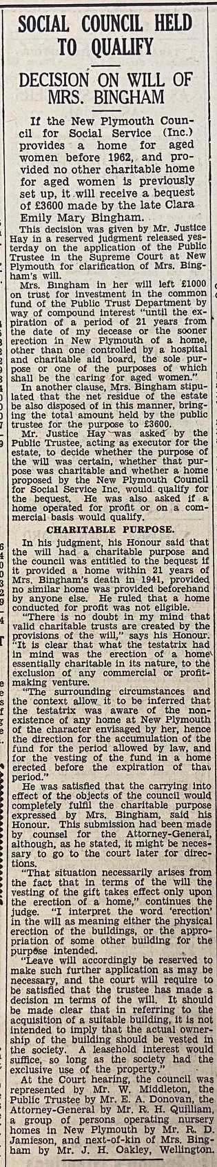 In late December 1950 the Supreme Court decided that the New Plymouth Council for Social Services Incorporated was the most suitable body to administer the Bingham bequest. After expenses were deducted from the sum of £3,636, the council was left with £2,200.