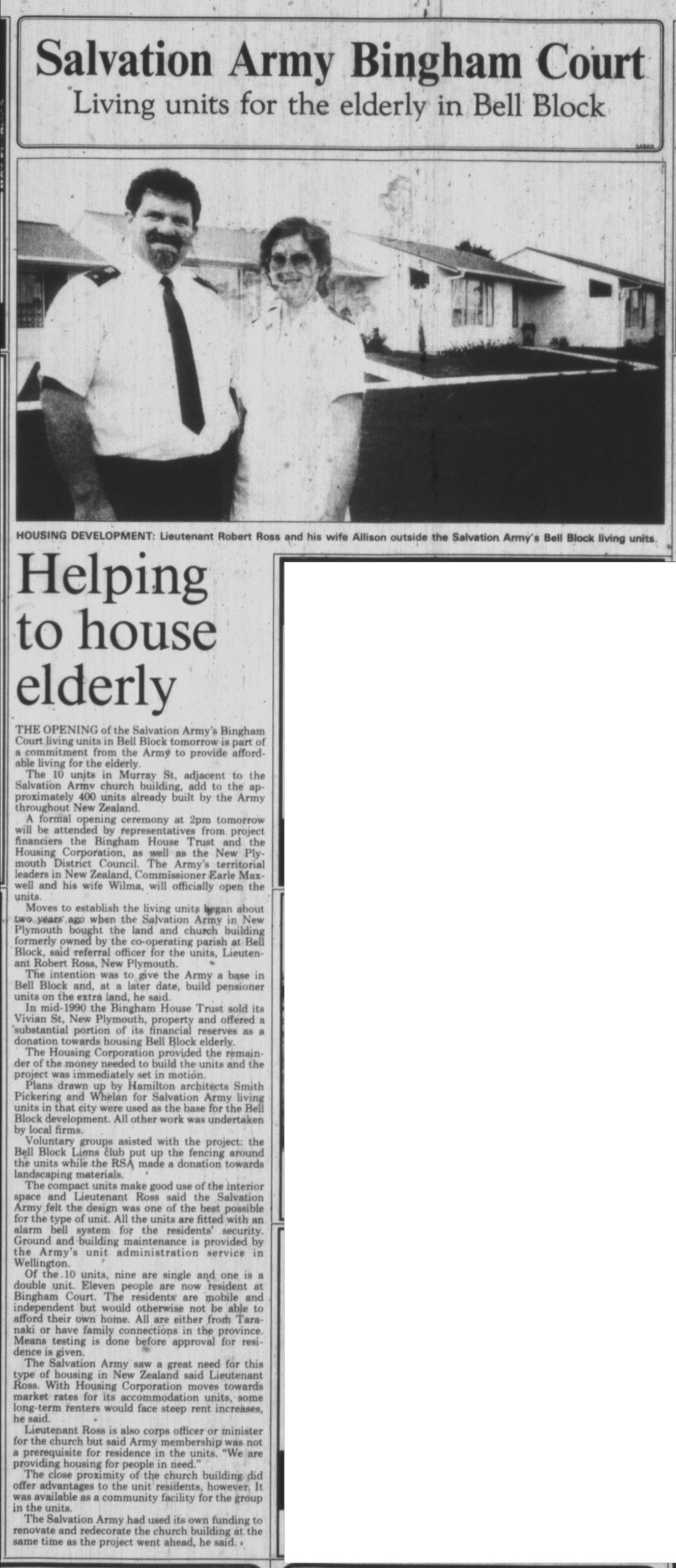 In 1992 the Salvation Army opened the "Bingham Court Independent Living Units' in Bell Block for elderly people. It was reported that that a substantial portion of the proceeds from the sale of the Vivian Street houses was donated by the Bingham House Trust to the Bell Block project.