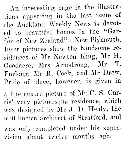 It was designed by the Stratford architect Mr. J. D. Healy. The choice of Healy was likely a reflection of the many years Charles Curtis had spent in business in Stratford. The house featured prominently in a full-page montage of "beautiful homes of New Plymouth" in the Auckland Weekly News. (Auckland Libraries Heritage Collections AWNS-19140226-41-1)