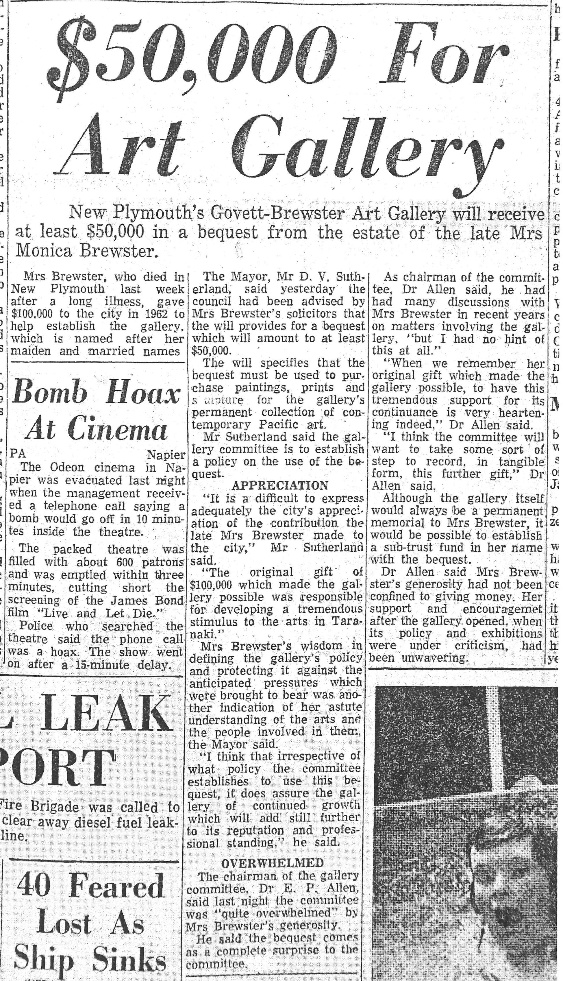Following Monica Brewster's death in December 1973, the gallery was the beneficiary of a $50,000 bequest from her estate.