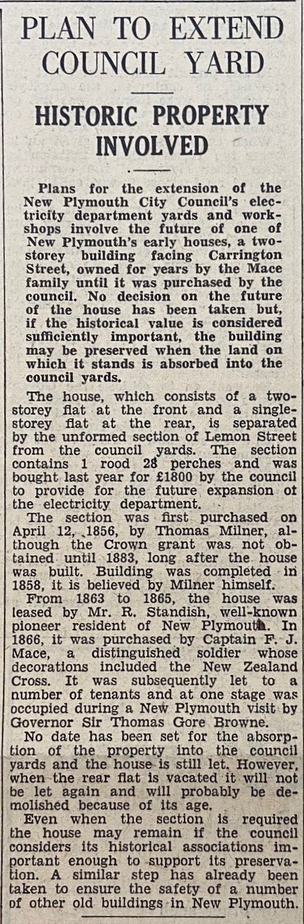 Subsequent owners have included Thomas Milner, Captain Charles Stapp and Arthur Standish. Captain Francis Mace also bought or leased the property in the 1860s. In 1918 it was purchased by one of his sons, Henry Mace, who sold it to New Plymouth City Council in 1951 for £1800.