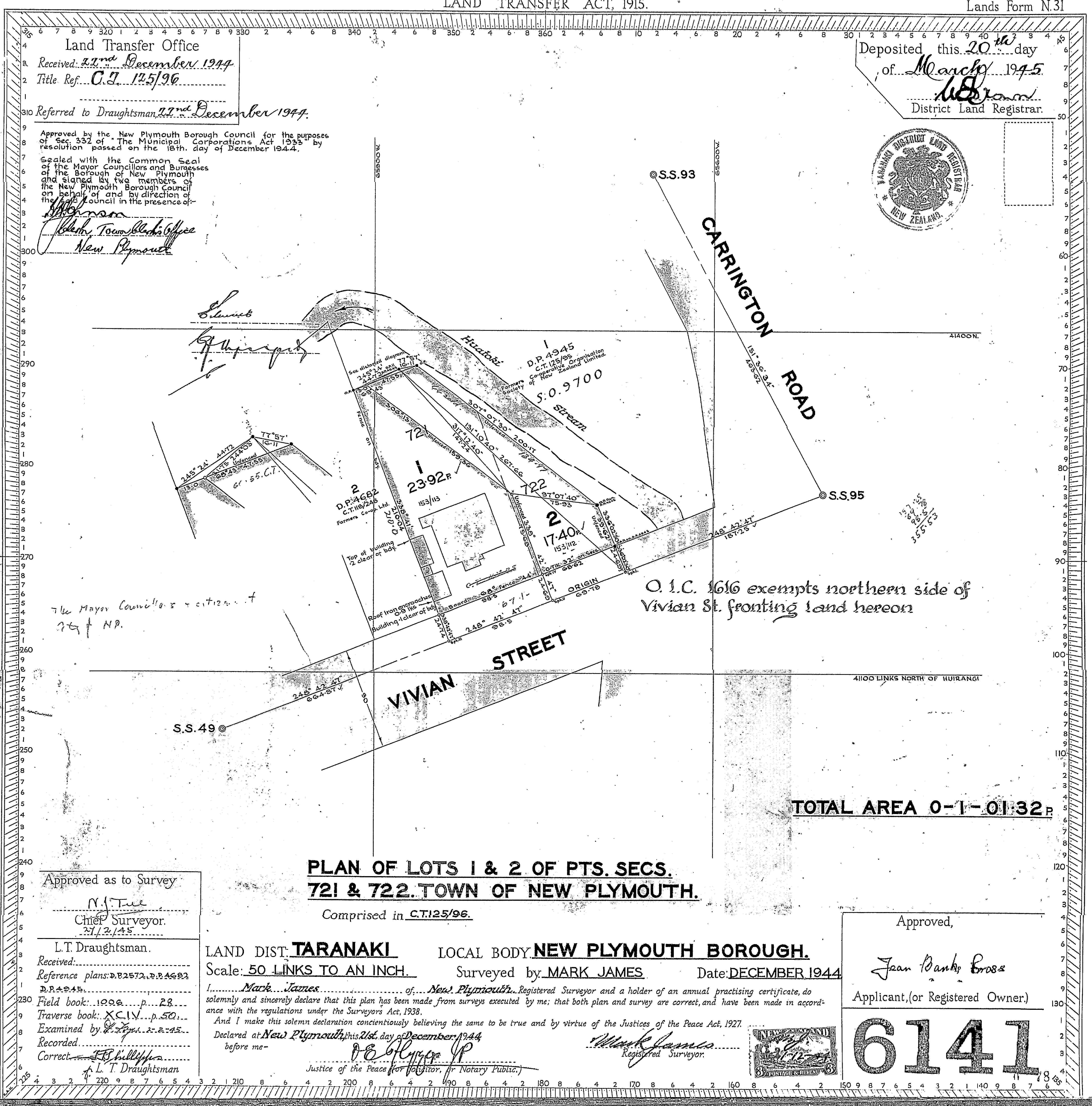 Taranaki DP6141 Sheet 1 (1944), ICS Pre 300,000 Cadastral Plan Index (Imaged by LINZ)