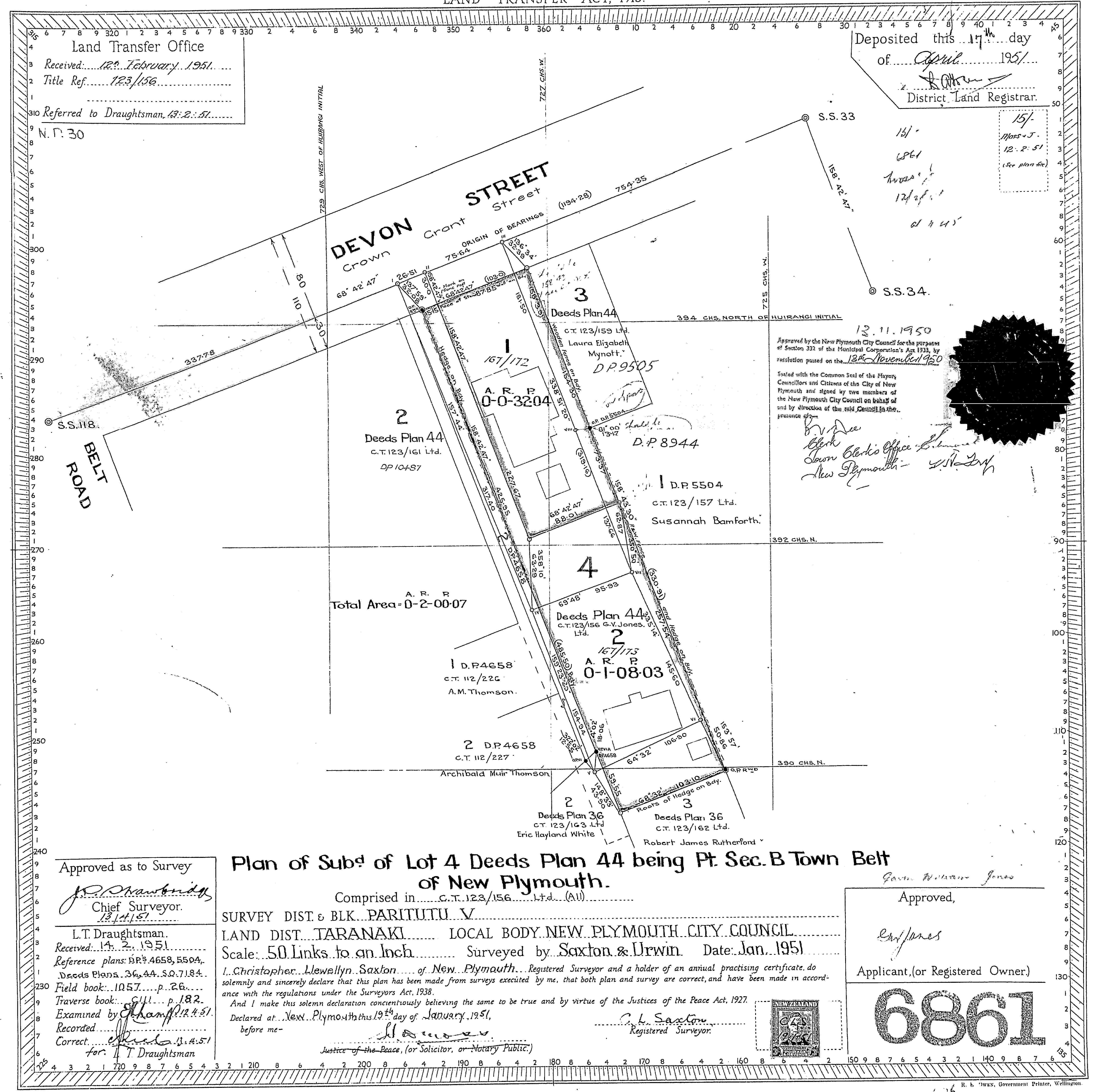 Taranaki DP6861 Sheet 1 (1951), ICS Pre 300,000 Cadastral Plan Index (Imaged by LINZ)