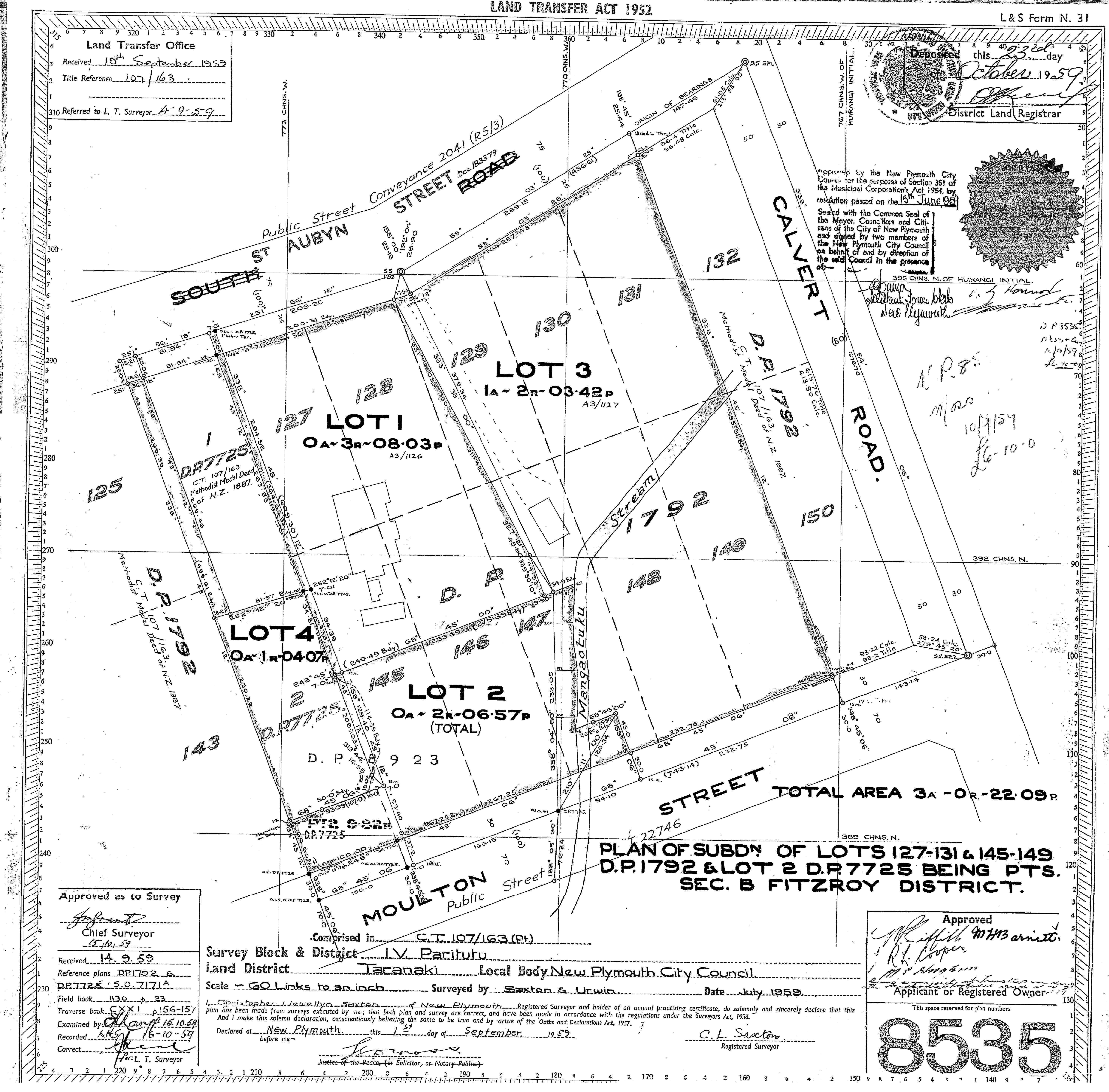 Taranaki (Lot 1) DP8535 Sheet 1 (1959), ICS Pre 300,000 Cadastral Plan Index (Imaged by LINZ)