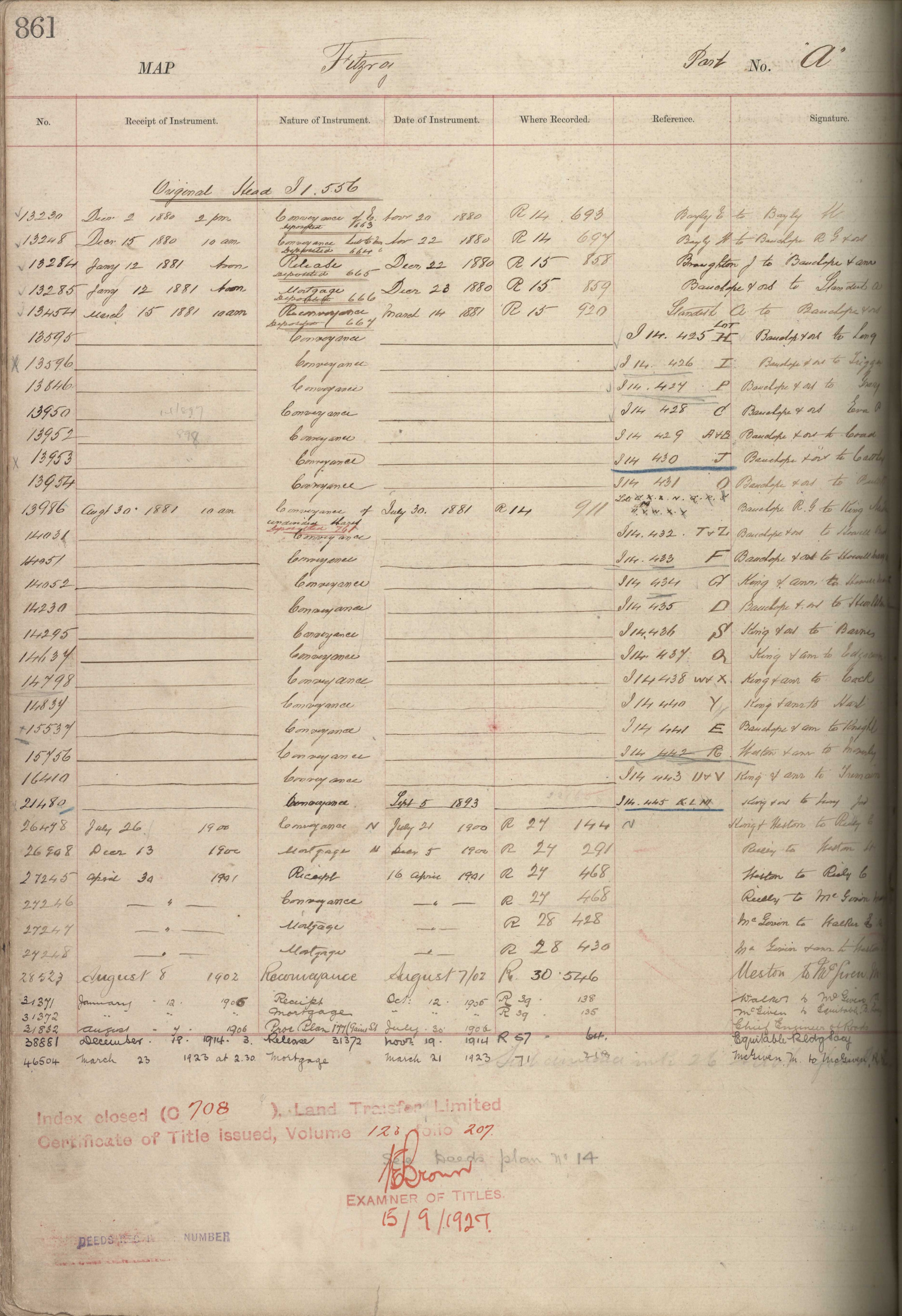 Town Belt (Part) A, Taranaki Land Deed Index I14 page 861. (Archives New Zealand)