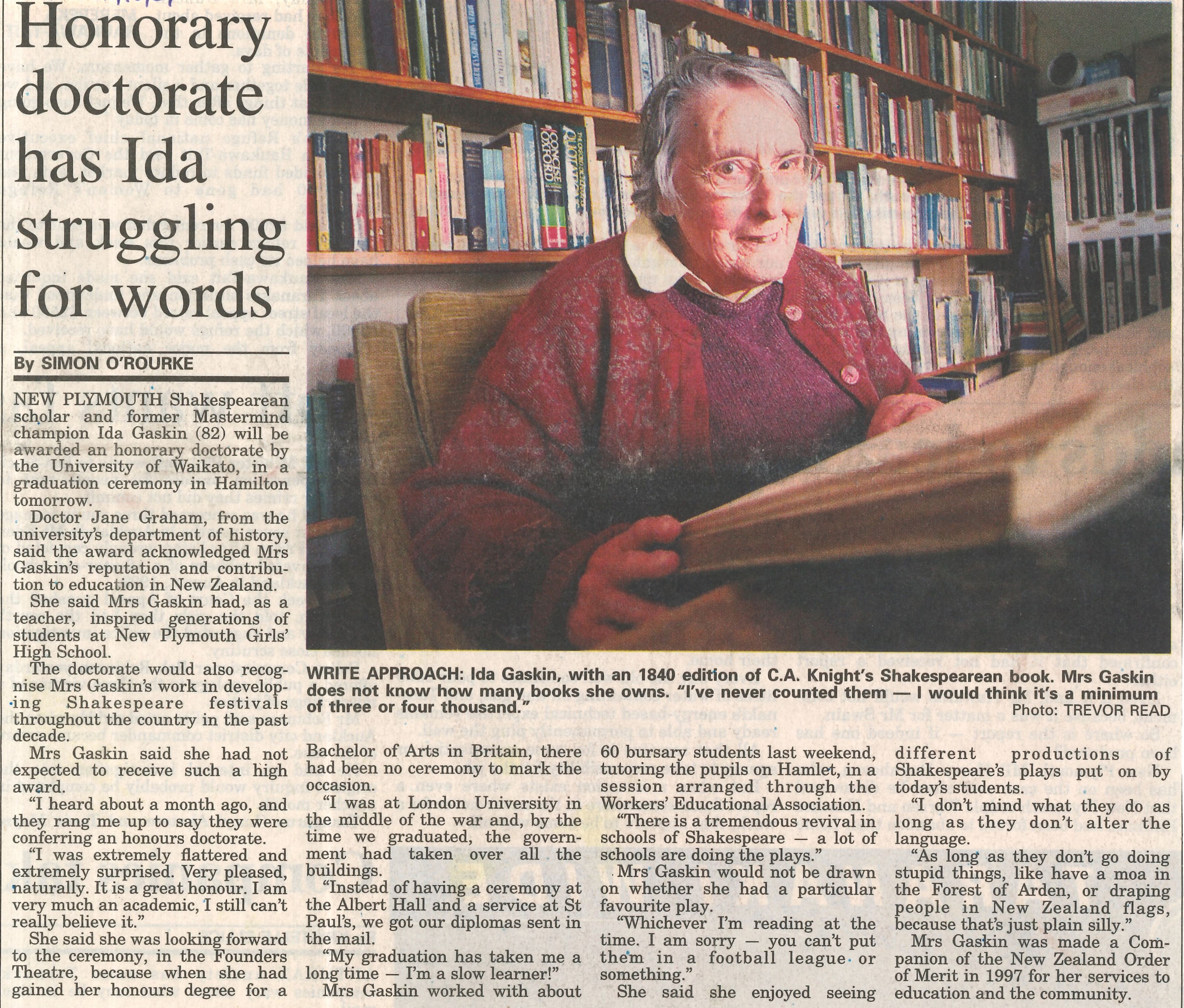 Those who were taught by Ida when she was an English teacher at New Plymouth’s Girls’ High School will recognise her commanding presence, quick wit, and clear views—qualities that left a lasting impression on generations of students.