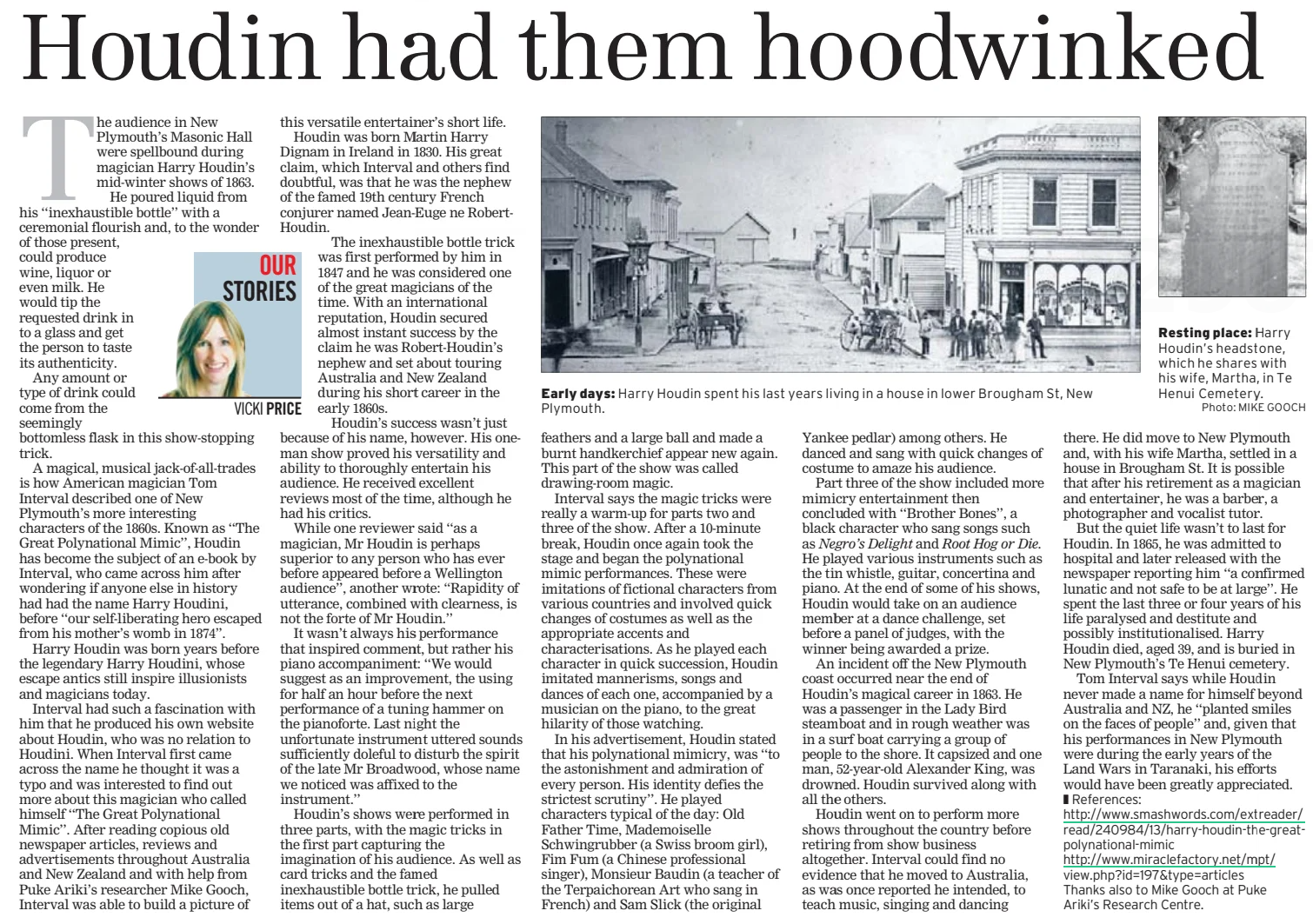 Houdin had them hoodwinked, Vicki Price (Taranaki Daily News 3 November 2012)