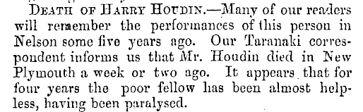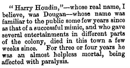 On 13 July 1869 the Colonist reported the death of Harry Houdin in New Plymouth "a week or two ago...It appears the poor fellow has been almost helpless, having been paralysed". The Otago Witness on 24 July also reported the death of Harry Houdin - this time it was stated that his real name was "Dougan".