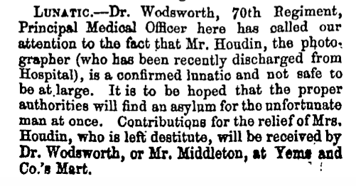 In May 1865 the Taranaki Herald reported that "Mr Houdin (who has been recently discharged from Hospital) is a confirmed lunatic and not safe to be at large...Contributions for the relief of Mrs Houdin, who is left destitute, will be received by...".