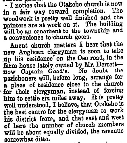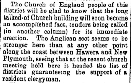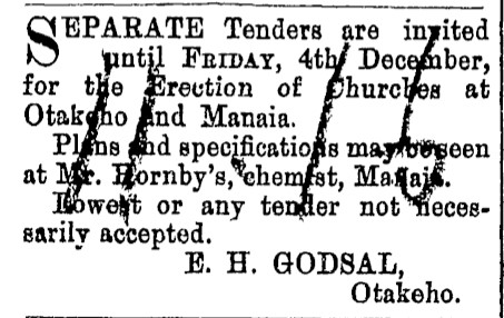 At the time the church was built it appears the section (Otakeho Town Section 51) was owned by Edward Godsal who was also responsible for inserting the tender advertisements.
