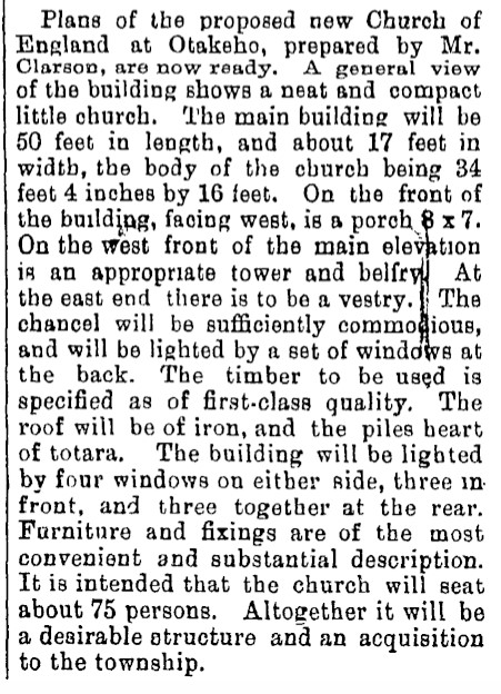 There are no further progress reports and then in August 1892 tender advertisements are placed once again for a "Church (new plans) at Otakeho". An article published on 5 September 1892 indicates that these "new plans" were drawn by Hāwera architect, Charles Clarson.