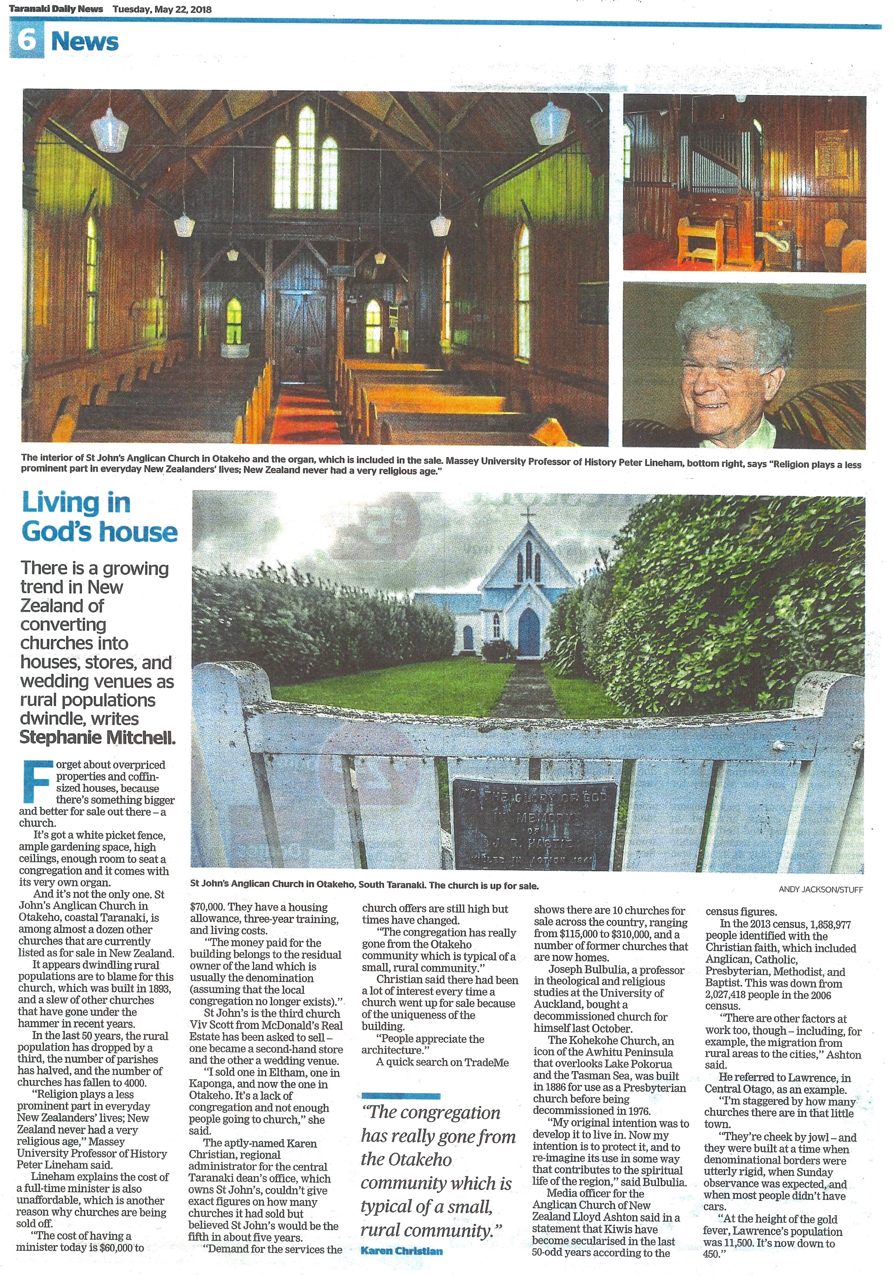Living in God's house (Taranaki Daily News 22 May 2018)