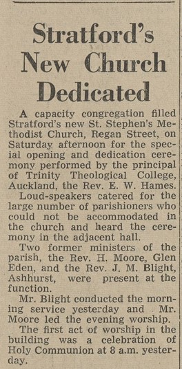 The foundation stone for St Stephen's Methodist Church on the corner of Regan and Orlando Streets in Stratford was laid on 15 July 1961 by the Revd. B.M. Chrystal, President of the Conference. The church was dedicated by the Rev. E.W. Hames, Principal of Trinity Theological College, on 20 October 1962.