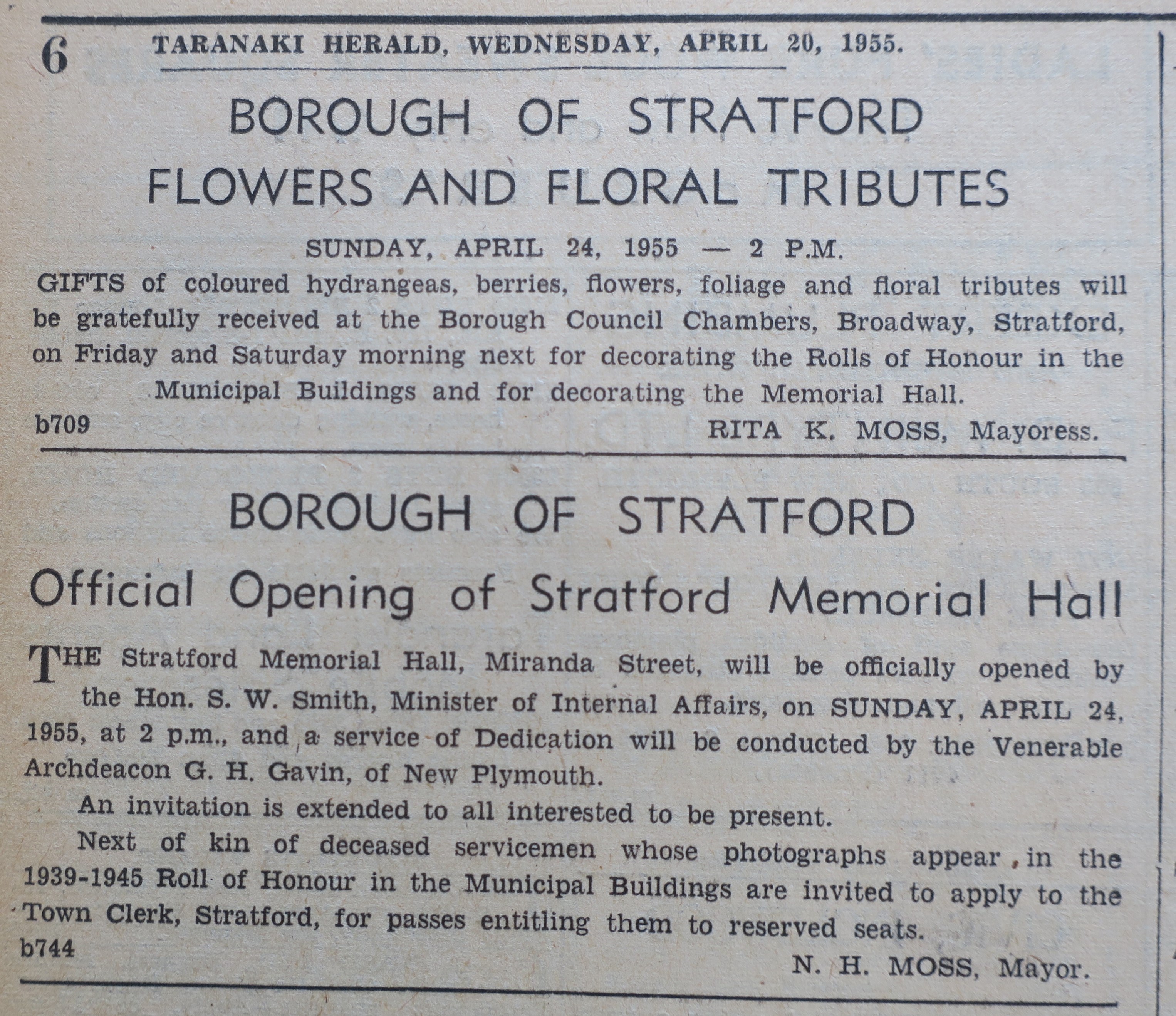Stratford Memorial Hall opened (Taranaki Herald 26 April 1955)