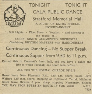 The hall was nicknamed “Taranaki’s Danceland” and earned a reputation as the region’s best venue – when hundreds of American sailors arrived in New Plymouth on the icebreaker USS Staten Island in November 1958 a gala dance was held in their honour at the Stratford War Memorial Hall, and revellers at New Year’s Eve dances were entertained by famous local acts like Colin King and the Harmonisers and Lew Pryme.