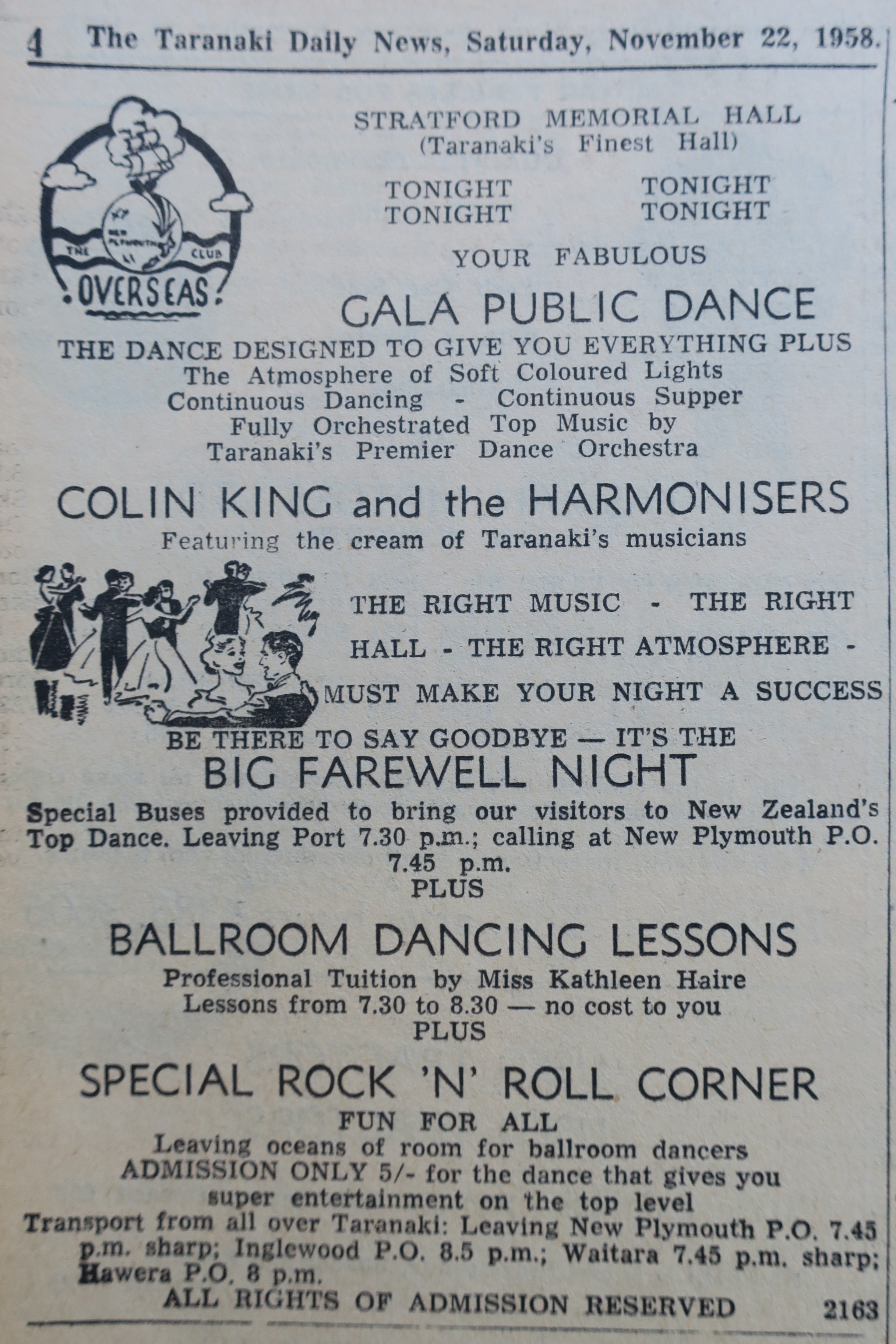 The Borough Council initially banned the use of the hall for public dances but from 12 May 1956 crowds of more than a thousand people attended fortnightly dances on Saturday nights. These were put on by The Overseas Club, a branch of the international organisation founded in England in 1910 for the purposes of promoting the British Empire