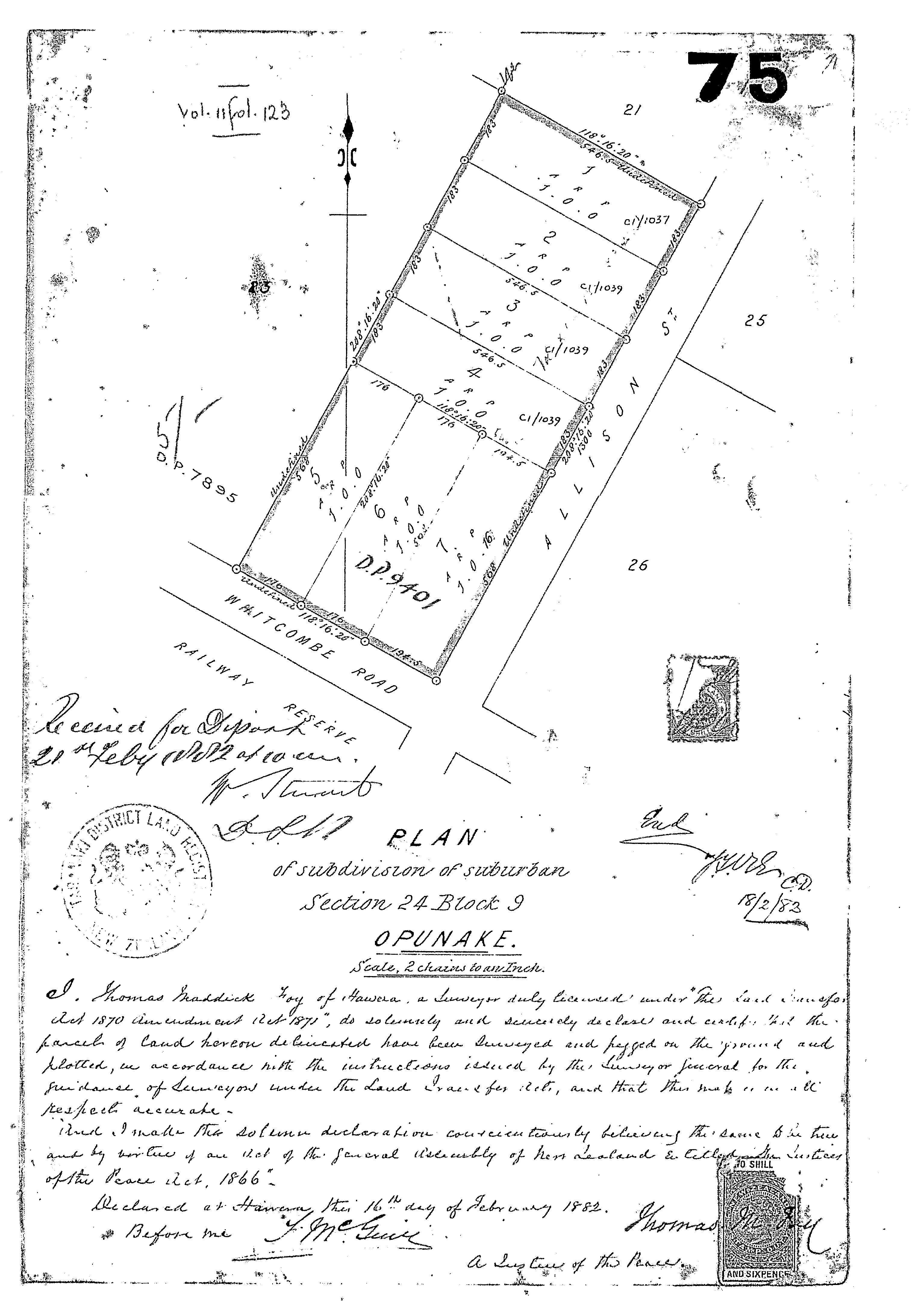 Taranaki DP75 Sheet 1 (1882), ICS Pre 300,000 Cadastral Plan Index (Imaged by LINZ)
