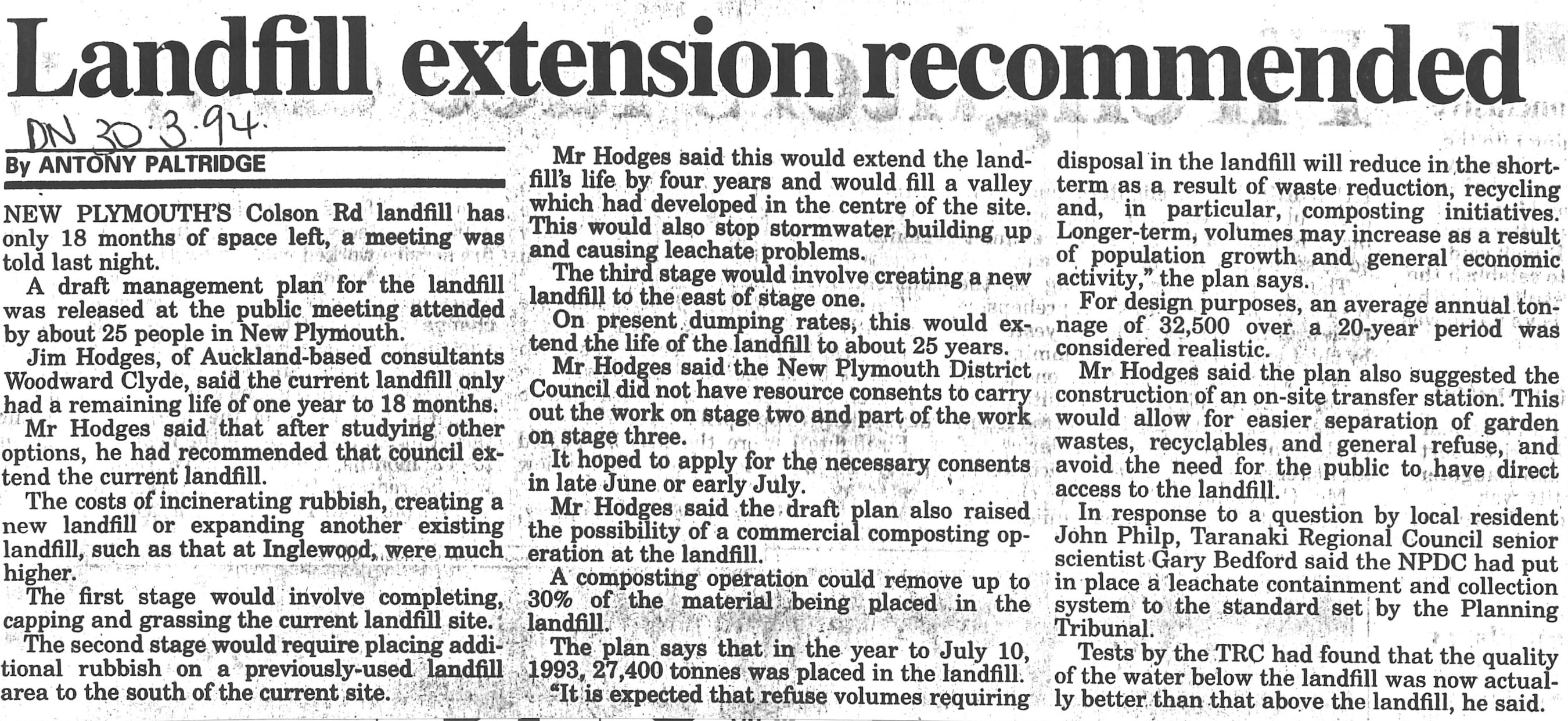 Landfill extension recommended by Antony Paltridge Taranaki Daily News 30 March 1994.
