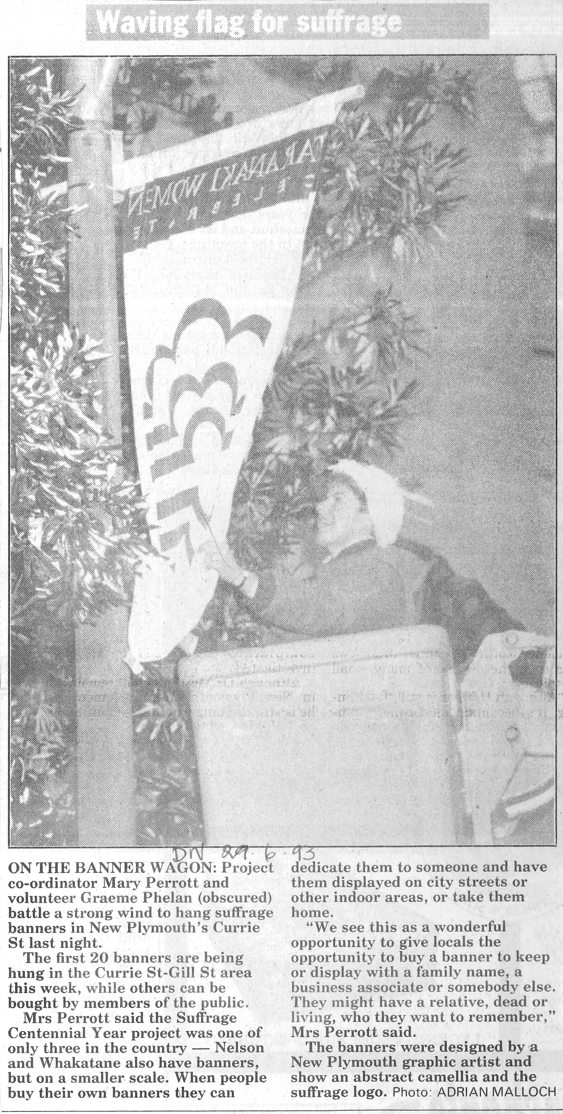 Hanging banners in Currie Street for the Suffrage Centennial Year project (Taranaki Daily News 29 June 1993)