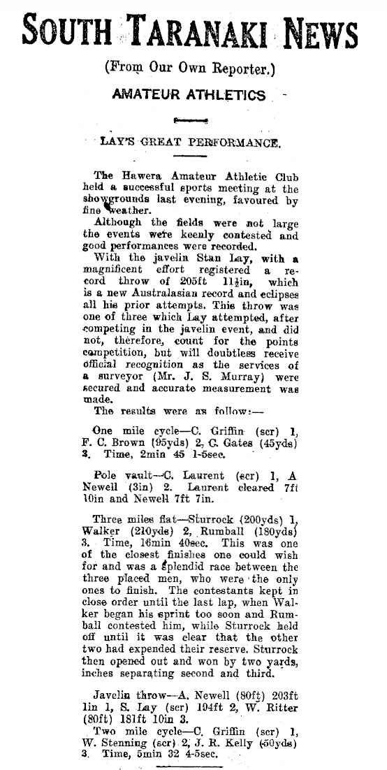 Alongside all the usual surveying tasks, newspaper reports suggest his role was more varied than might be the case today. Murray’s skills proved especially valuable in 1927 at a sports meeting held by the Hawera Amateur Athletic Club. The great Taranaki javelin thrower Stan Lay was competing and his throw of 205 feet 11 ½ inches (nearly 63 metres) set a new Australasian record. Official recognition was deemed to be mere formality as “the services of a surveyor (Mr J.S. Murray) were secured and accurate measurement made”.