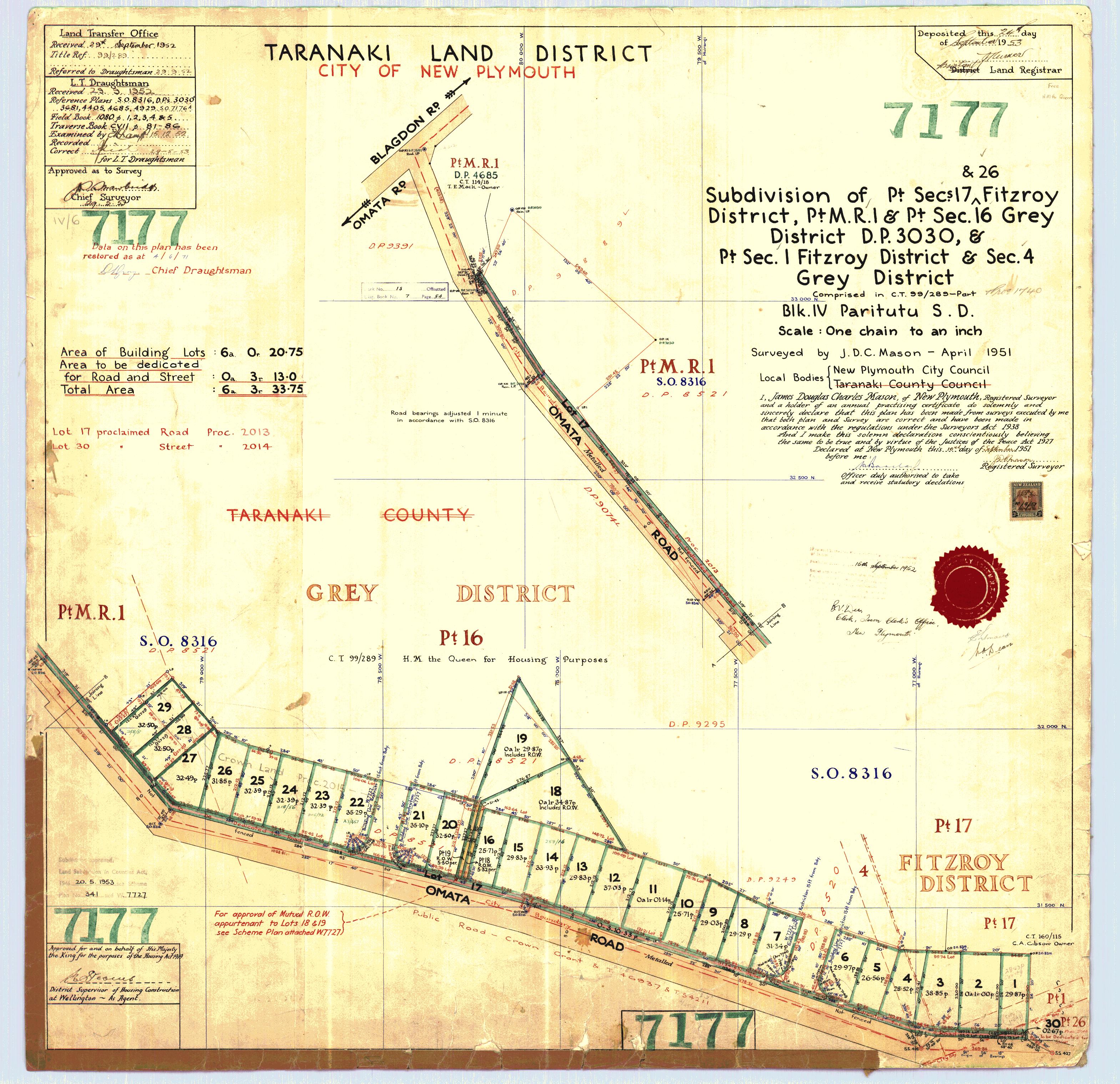 Taranaki DP7177 Sheet 1 (1951), ICS Pre 300,000 Cadastral Plan Index (Imaged by LINZ)