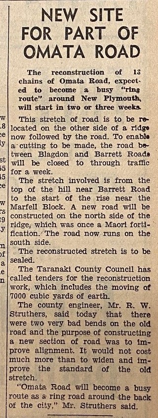 Early survey maps show Ōmata Road following almost the same route as it does today from what was then Elliot Road (now Tukapa Street), down to the bottom of the valley where it makes a sharp turn left and then up the hill, across Barrett Road and south to Ōmata.