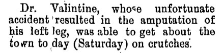 * While most sources put the date of the accident as 1894 (when Valintine was aged 29) this brief report from the Taranaki Daily News (20 August) suggests it may have occurred in 1898.